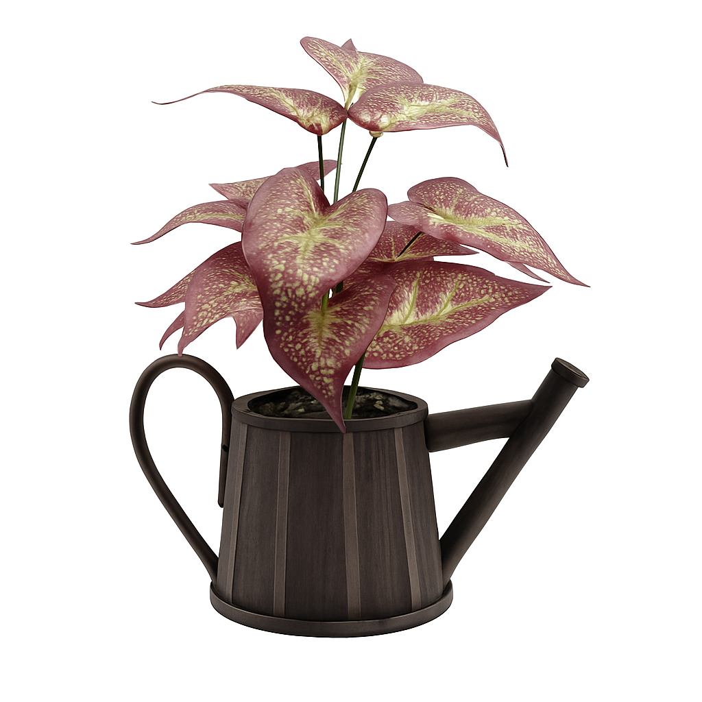 עציץ דקורטיבי עשוי עץ טבעי בצורת משפך מים, ובתוכו סידור עלי קלדיום מלאכותיים – צמח הידוע גם בשם כנפי מלאך בזכות צורת העלים הלבבית והדוגמה המרהיבה בצבעי בורדו ורוד עם נימים בהירים. שילוב מושלם בין חמימות לאלגנטיות, המוסיף נופך טבעי, ואינו דורש טיפוח. מתאים לקישוט שולחן, מדף, סלון, מטבח או משרד.