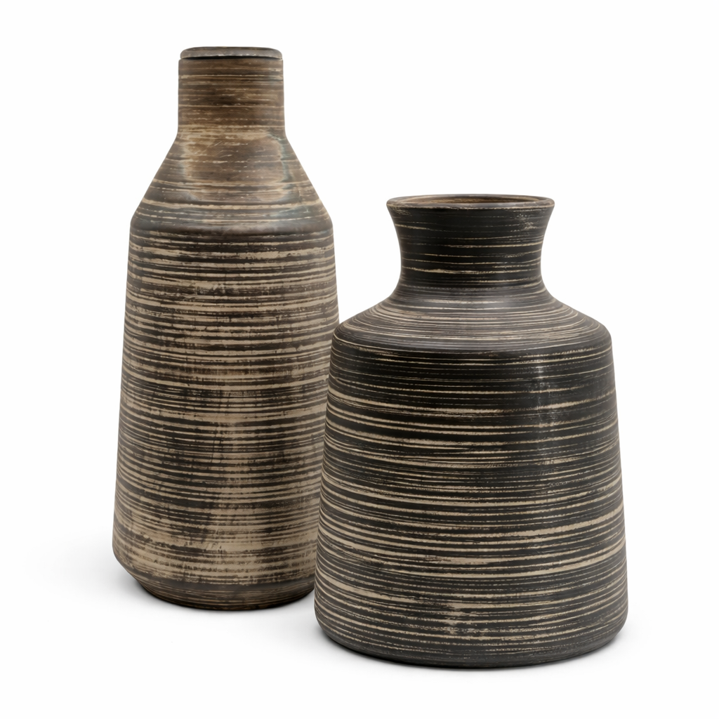 סט אגרטלי קרמיקה בעיצוב פסים מאופק וקווי, היוצר מראה מודרני, נקי ועל־זמני. הסט כולל שני אגרטלים בגדלים משלימים, המתאימים להצבה יחד ליצירת קומפוזיציה מאוזנת או לפיזור נפרד בחלל. מתאים לפרחים יבשים, ענפים דקורטיביים או כפריט נוי בפני עצמו, ומשתלב היטב בעיצוב מינימליסטי, מודרני, תעשייתי או מונוכרומטי.