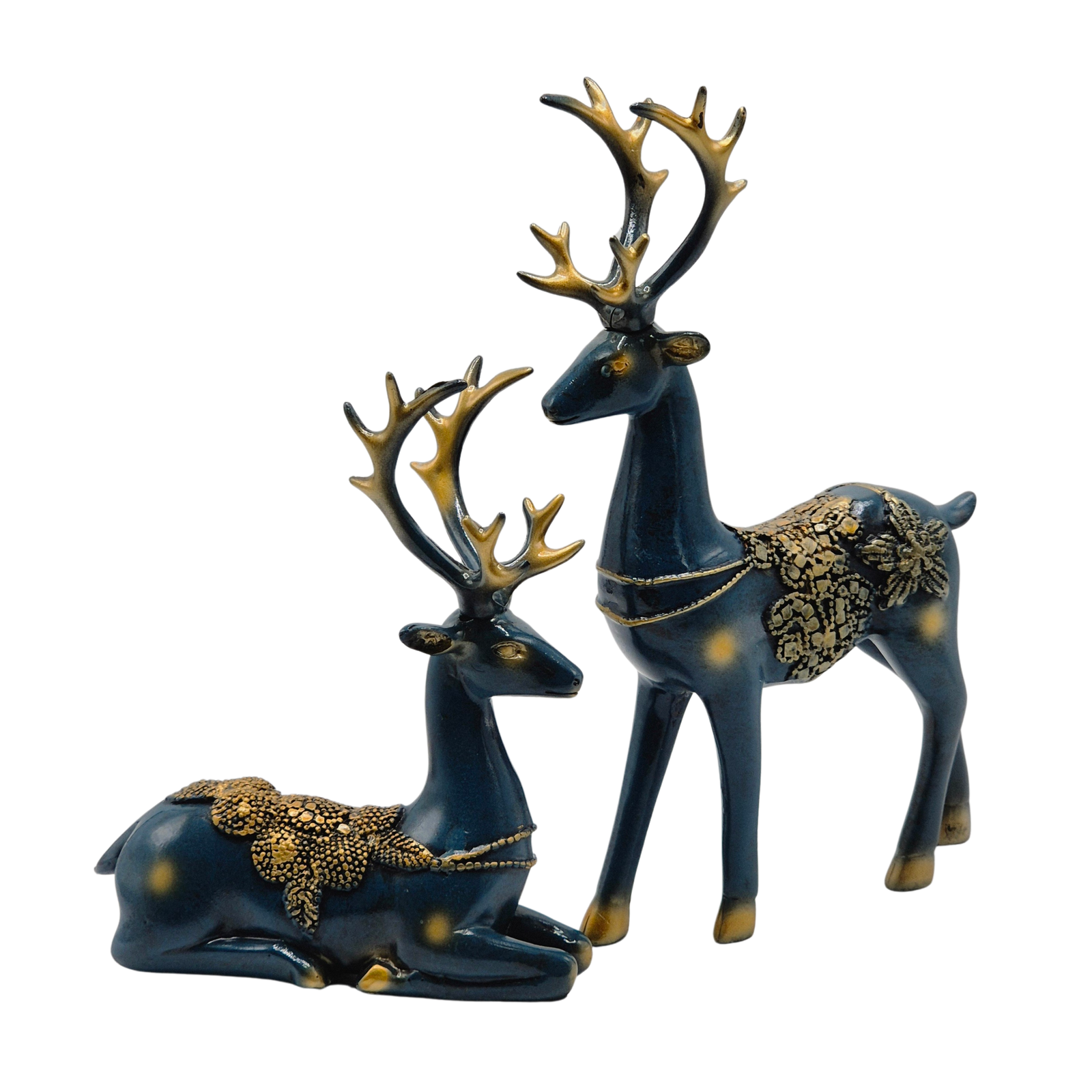 סט דקורטיבי יוקרתי של שני איילים בגוון כחול כהה עמוק עם עיטורי זהב עדינים, המשלב אלגנטיות שקטה ונוכחות מרשימה. השילוב בין אייל עומד לאייל שוכב יוצר קומפוזיציה הרמונית ומאוזנת, המתאימה לסלון, מזנון, מדף מעוצב או חלל אירוח. פריט נוי ייחודי המוסיף עומק, אופי ונגיעה של יוקרה טבעית לעיצוב הבית.