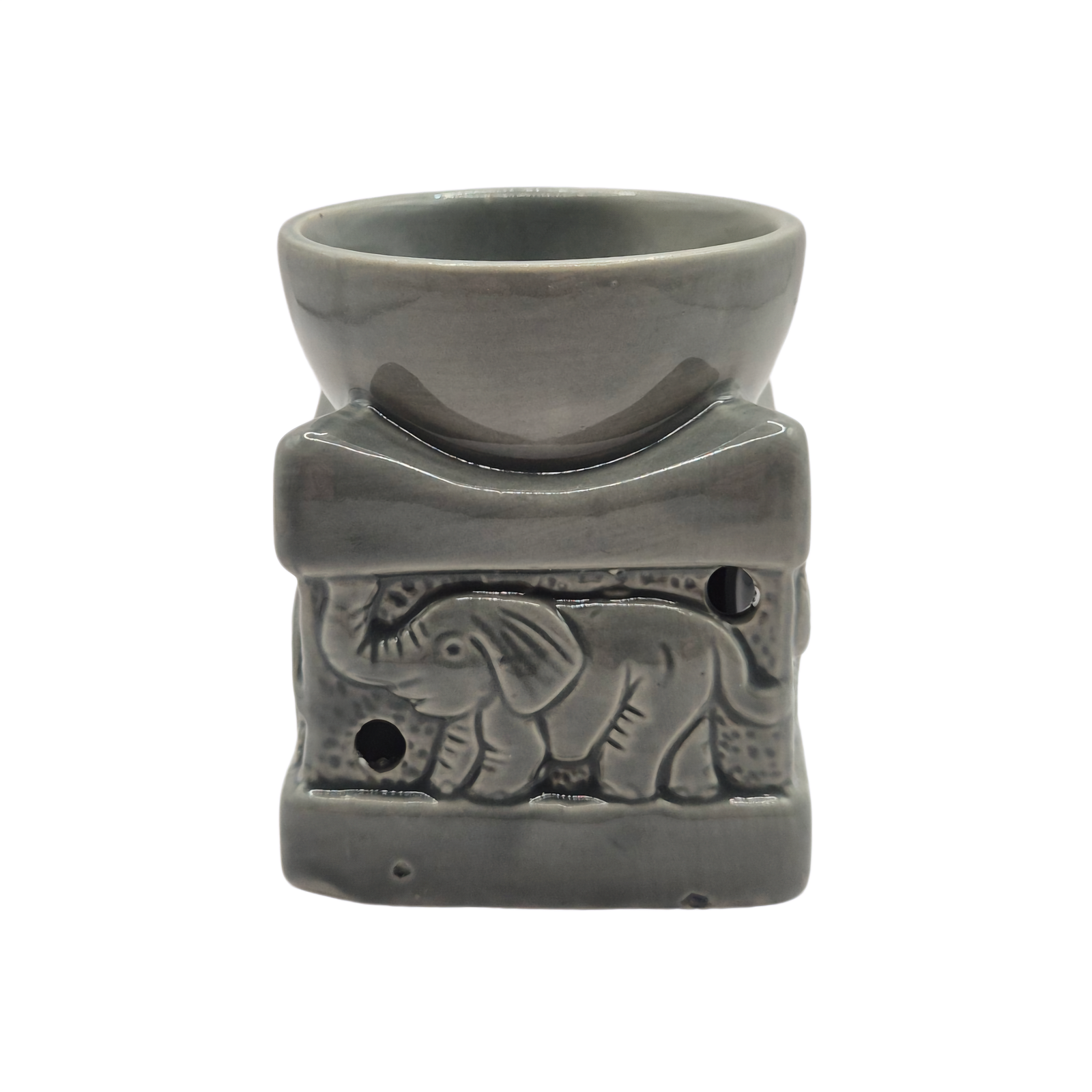 מבער שמנים ארומטי מקרמיקה בעיצוב פיל עדין, בעבודת יד ובגימור חלק ונעים. קערה עליונה להנחת שמן ארומה או קוביית שעווה, ופתח אחורי לנר חימום.
