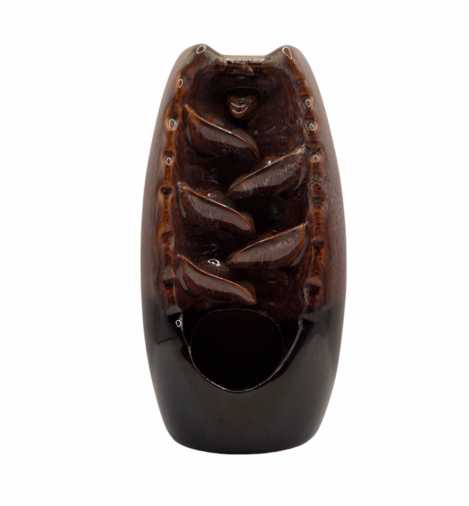 מפל עשן דקורטיבי מקרמיקה בגוון חום עמוק, בעיצוב מדורג היוצר אפקט מרהיב של עשן הזורם כלפי מטה כזרימת מים שקטה. הגימור החלק והצבע האדמתי מעניקים תחושת חמימות, עומק וחיבור לטבע, ומשתלבים בהרמוניה בעיצוב רגוע ועל־זמני. מתאים לקטורת מסוג Backflow, ומושלם לפינת מדיטציה, יוגה, חלל טיפולי או כתוספת אלגנטית ומרגיעה לעיצוב הבית.