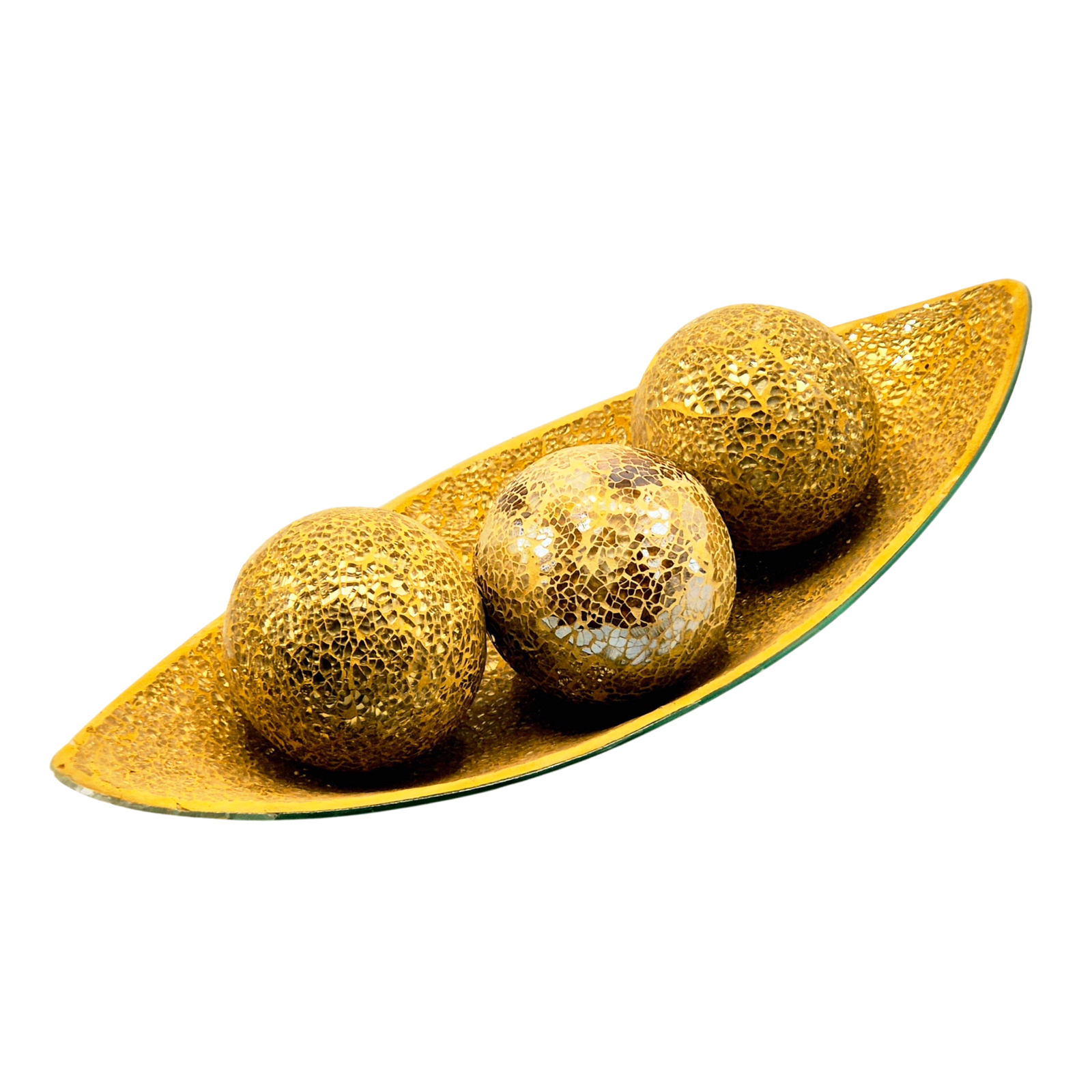 סט דקורטיבי יוקרתי הכולל קערת נוי מוארכת ושלושה כדורים תואמים בגימור זהב מבריק עם טקסטורת “קרקל” ייחודית. העיצוב האלגנטי והנוצץ מוסיף לחלל מראה עשיר ומוקפד, מושלם למרכז שולחן, מזנון או קונסולה יוקרתית. הסט משלב איזון והרמוניה עיצובית, ויוצר מוקד עניין מרשים עם ניחוח מלכותי.