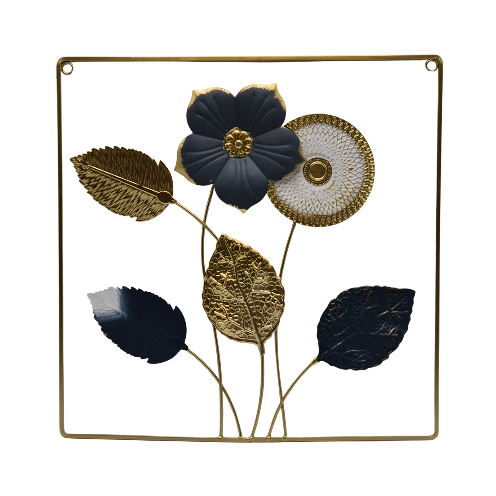 עיצוב קיר מתכת יוקרתי בסגנון מודרני, המשלב פרחים ועלים בגווני זהב לבן ושחור עמוק במסגרת מתכת דקה. מראה הזהב המבריק לצד השחור המט יוצר ניגוד אלגנטי ומרשים, המתאים במיוחד לעיצוב סלון, מבואת כניסה או חדר עבודה. פריט קיר אומנותי המשדר כוח, אלגנטיות ונוכחות בכל חלל.