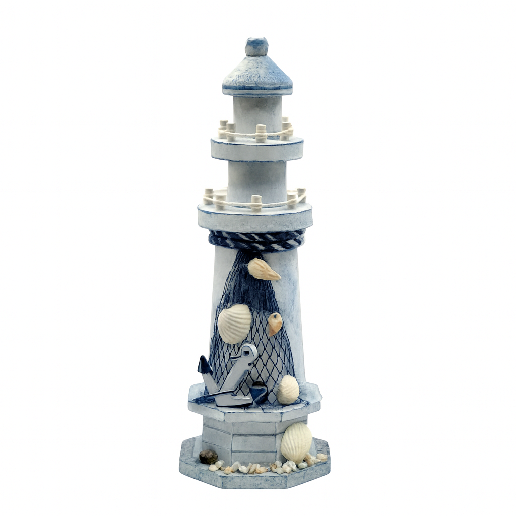 מגדלור דקורטיבי מעץ בגווני כחול ולבן, בעיצוב ימי קלאסי המשלב רשת דייג, צדפים, חבל ועוגן. הפריט מביא עימו ניחוח של חוף ים, רוגע ורוח מלחים נוסטלגית. אידיאלי להוספת טאץ’ מרענן לפינת ישיבה, מדף או חדר אמבט בסגנון ימי, ומתאים כמתנה מושלמת לאוהבי הים וההרמוניה של הגלים.