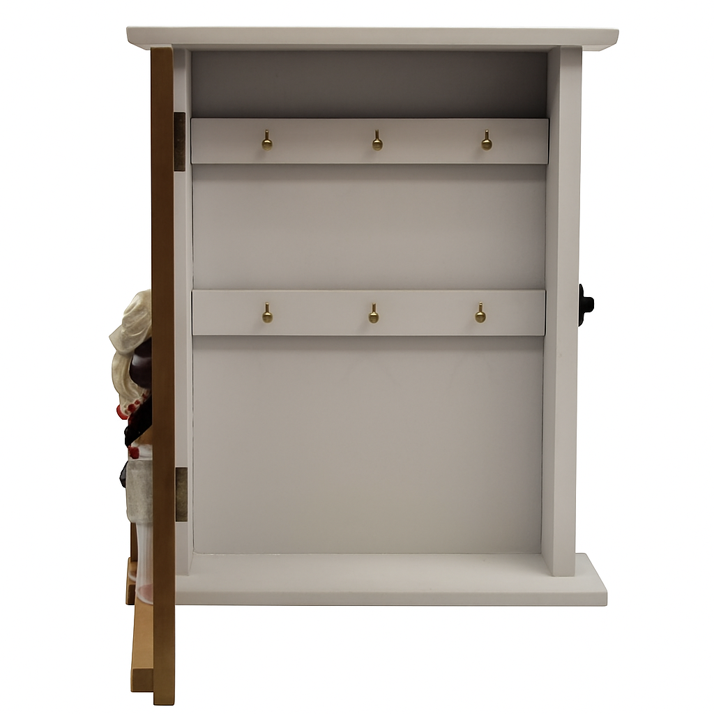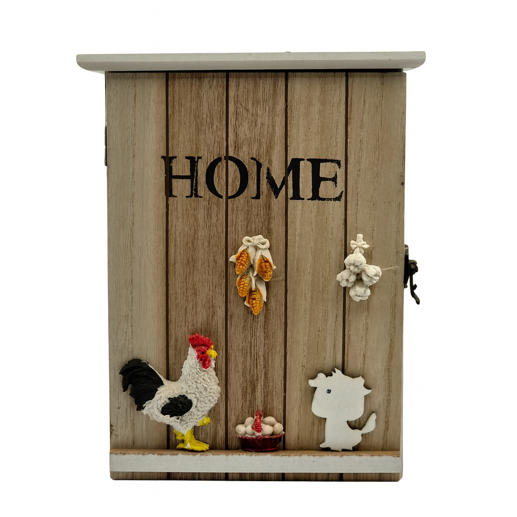 תיבת אחסון למפתחות בעיצוב כפרי נעים ומזמין, עשויה עץ טבעי בגוון בהיר. בפנים – שישה ווי תלייה נוחים לשמירה על סדר מושלם בבית, בכניסה או במטבח.