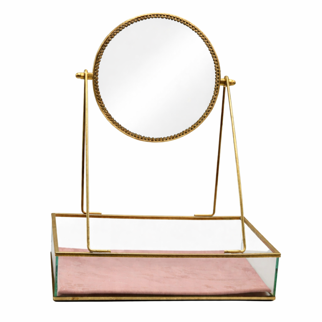 מעמד תכשיטים מעוצב בקו אלגנטי המשלב מראה עגולה עם מסגרת מתכת בגימור זהב ובסיס בגוון רוז עדין ומעודן. המבנה הנקי והקליל יוצר איזון בין פונקציונליות לאסתטיקה יוקרתית, ומאפשר אחסון נוח של תכשיטים, שעונים ואביזרים קטנים. הבסיס כולל מגש זכוכית עם ריפוד בד רך, המתאים לשולחן איפור, חדר שינה או פינת התארגנות, ומהווה גם פריט דקורטיבי מוקפד ומתנה אלגנטית.