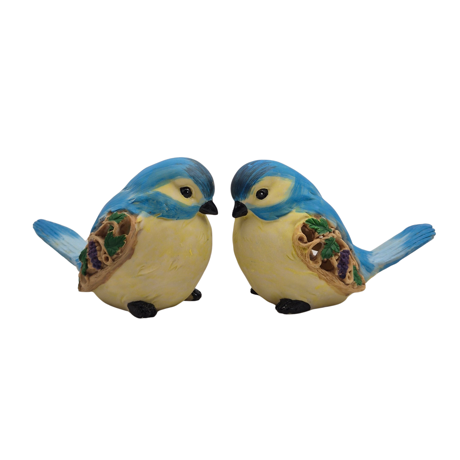 זוג ציפורי אהבה דקורטיביות בצבעי כחול-צהוב רכים, המעוטרות בפרטים עדינים של סלסלה עם ענבים ועלים. פריט קרמי מלא קסם המסמל זוגיות, נאמנות ורכות. מתאים לקישוט מדף, שידה, חלון או גן. מוסיף חמימות, צבעוניות ותחושת טבע לכל חלל. מושלם כמתנה קטנה או כפריט משלים לעיצוב הבית.
