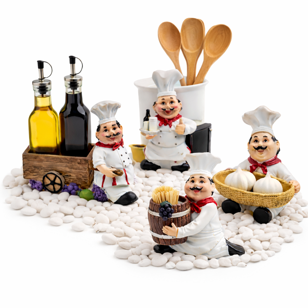מארז מתנה דקורטיבי מלא שמחת חיים, המכניס למטבח ולפינת האירוח תחושת שפע, בישול ואהבה לאוכל טוב. המארז כולל פסלוני שפים עליזים המיועדים לשמן זית, לחומץ, לשום, לקיסמי שיניים ולסכו"ם, ומשתלבים יחד לקומפוזיציה חמה, צבעונית ומזמינה. מושלם לעיצוב מטבח, מדפי תצוגה, אי מטבח או השיש.
