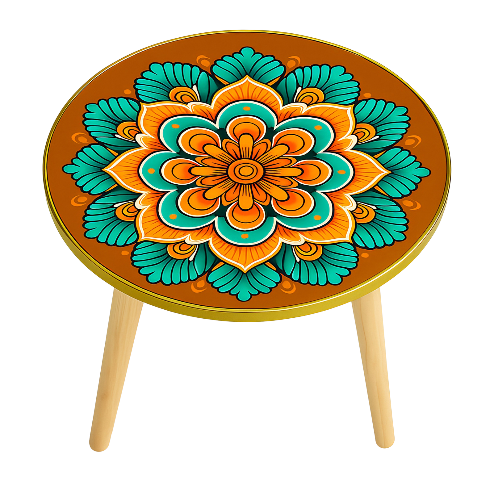 שולחן מנדלה עגול בעיצוב אקזוטי, בהשראת פרח הלוטוס הטרופי – סמל של חיות, התחדשות ואור. העיטור הסימטרי בגווני כתום, טורקיז וזהב משלב חום ואנרגיה עם רוגע ומים, ויוצר תחושת תנועה והרמוניה טבעית. רגלי העץ הבהירות מאזנות את הצבעוניות התוססת ומוסיפות חמימות טבעית. השולחן מתאים לעיצוב בוהו, טבעי או מודרני, ומשמש כפריט דקורטיבי מרשים לסלון, פינת ישיבה או חדר השראה.
