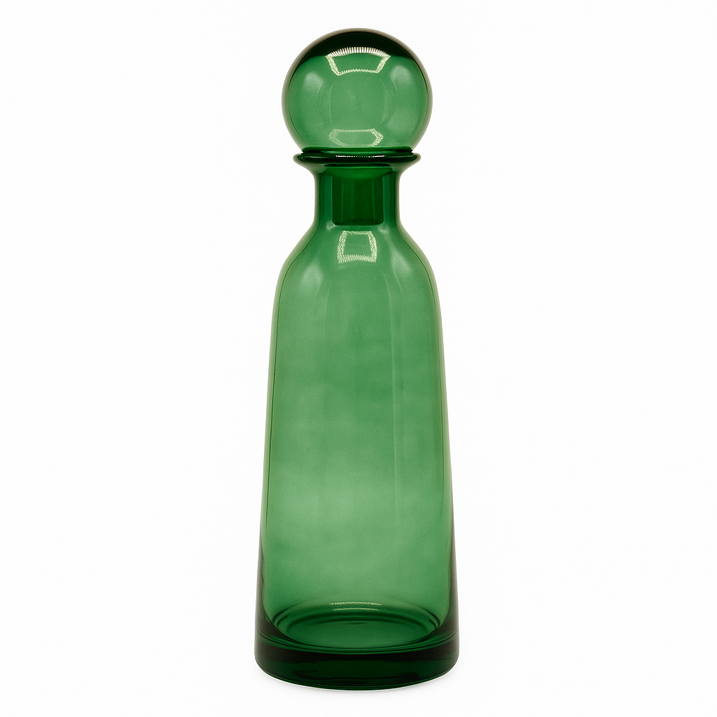 דקנטר זכוכית בעיצוב אלגנטי ומרענן, עשוי מזכוכית איכותית בגוון ירוק עתיק עם מכסה זכוכית כדורי המוסיף טאץ' עיצובי ייחודי. הצבע הירוק מעניק תחושת טבע, רוגע וחידוש, בשילוב קווים נקיים וברק מעודן. מושלם למזיגת יין, וויסקי או מים, וכן כפריט נוי מעוצב לשולחן, למדף או לבר ביתי.