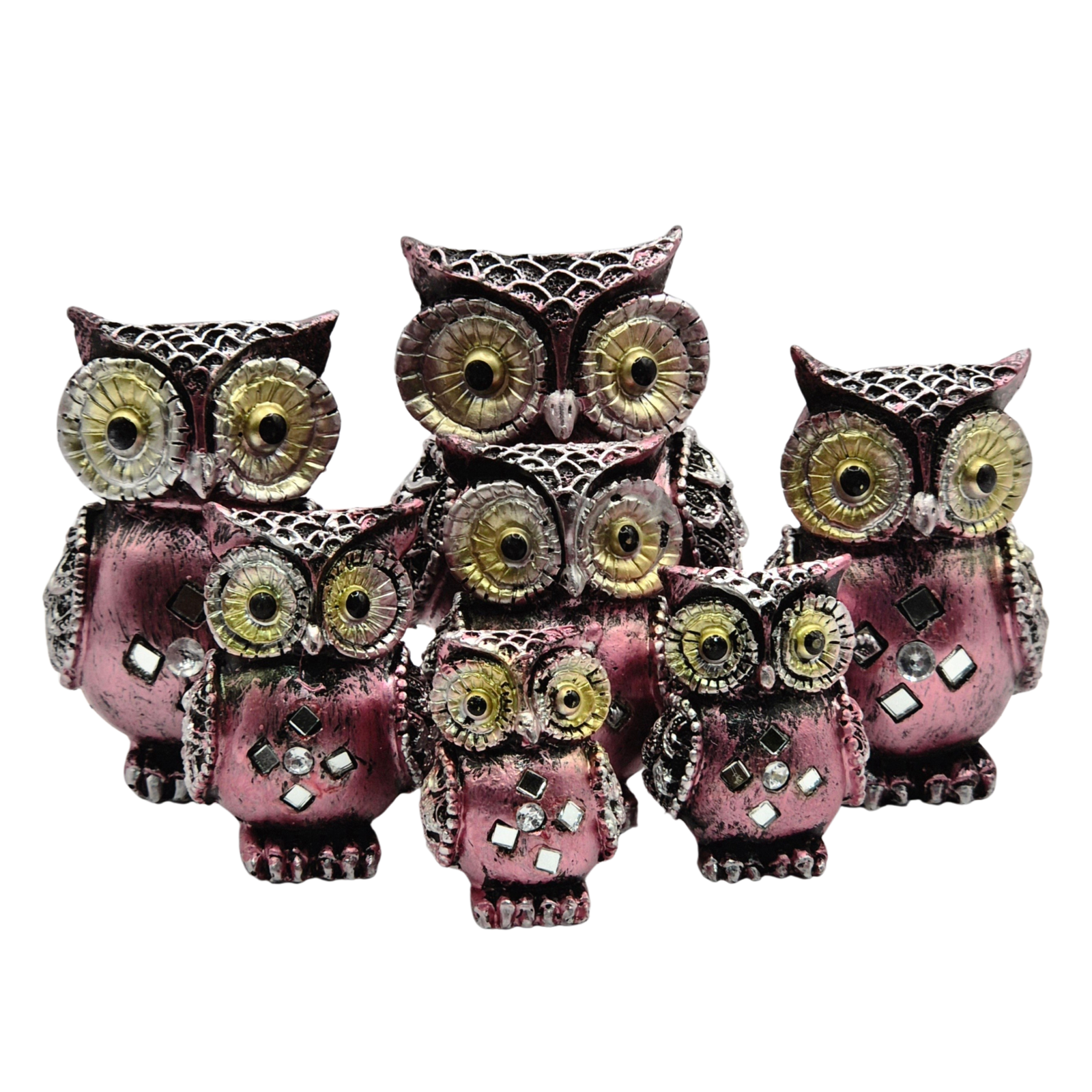 סט ינשופים דקורטיביים מרהיב הכולל משפחת ינשופים בעיצובים וגדלים שונים, בגוון ורוד מטאלי עם עיטורי כסף וזהב. כל ינשוף מפוסל בפרטים עדינים ומעוטר באבני פסיפס קטנות המשקפות אור ומוסיפות ברק ייחודי. פריט מלא קסם, המסמל חכמה והגנה, ומוסיף שלווה ואלגנטיות לכל חלל – סלון, מדף ספרים או חדר עבודה. מושלם גם כמתנה מקורית ואמנותית לאוהבי עיצוב וחיות.