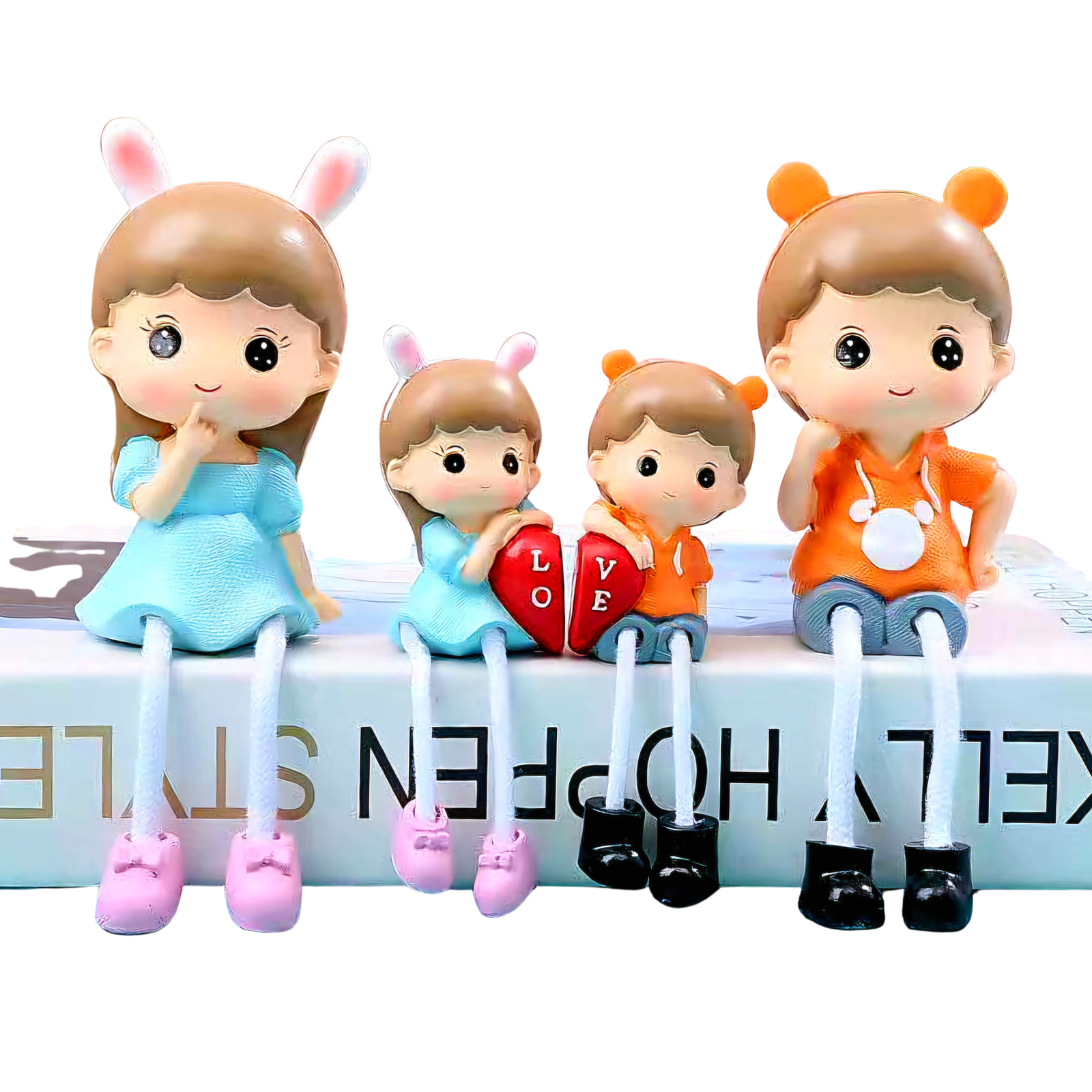 סט בובות דקורטיבית בעיצוב ילדותי ושובב – זוג הורים ושני ילדים לבושים בגווני תכלת, ורוד וכתום, עם כובעים בעלי אוזני ארנבים חמודות ולב אדום סדוק שעליו האותיות LOVE. עשוי שרף איכותי, צבועות ביד, ומעוטרות בפרטים עדינים היוצרים מראה חמים וידידותי. מושלם לקישוט חדר ילדים, מדף בסלון או כמתנה מקורית ליום המשפחה, יום האהבה, לידה חדשה או חנוכת בית.