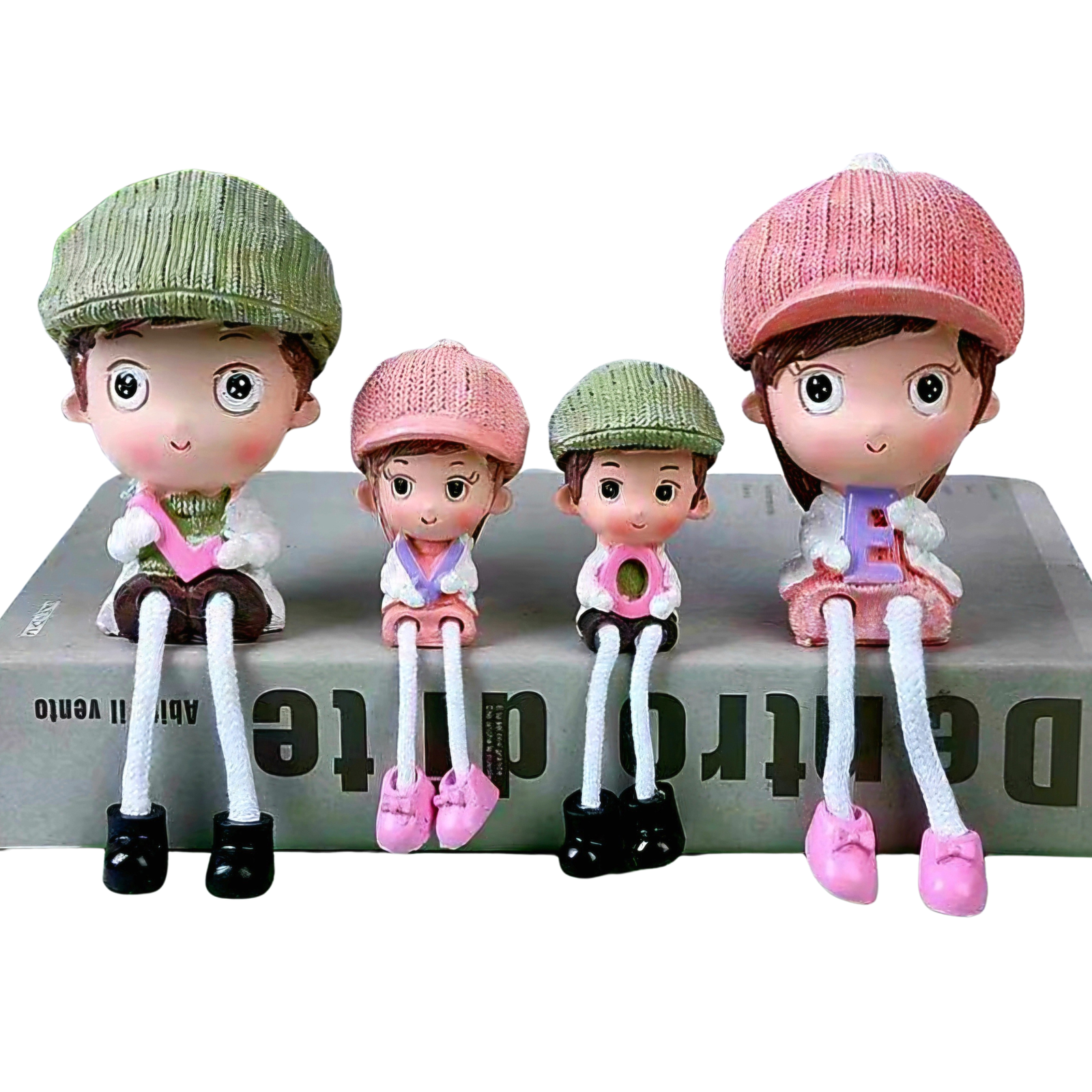 סט בובות דקורטיבית – זוג הורים ושני ילדים יושבים זה לצד זה, חובשים כובעים סרוגים בגווני ורוד וירוק ומחזיקים את אותיות המילה LOVE. הבובות עשויות שרף איכותי בנגיעות צבעי פסטל עדינות. מושלם לקישוט מדף, חדר ילדים, סלון או כמתנה ליום המשפחה, יום אהבה, או חנוכת בית.