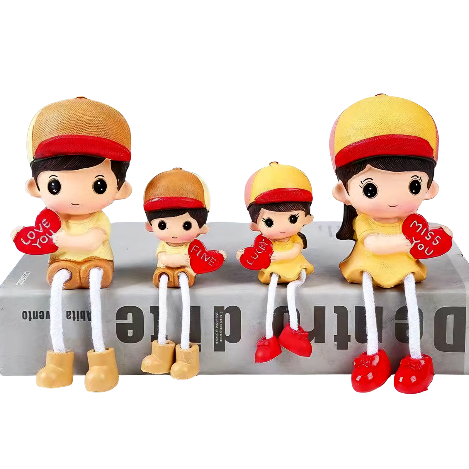 סט בובות דקורטיביות בצבעים חמים ועליזים של אדום, צהוב וזהב. לכל דמות חיוך כובש והיא אוחזת בלב קטן עם מילת אהבה. פריט נוי שיוסיף טאץ’ צבעוני ומלא לב לכל פינה בבית – בחדר הילדים, על השידה או המדף בסלון, או בספרייה. מושלם כמתנה ליום המשפחה, יום האהבה, לידה חדשה או חנוכת בית.