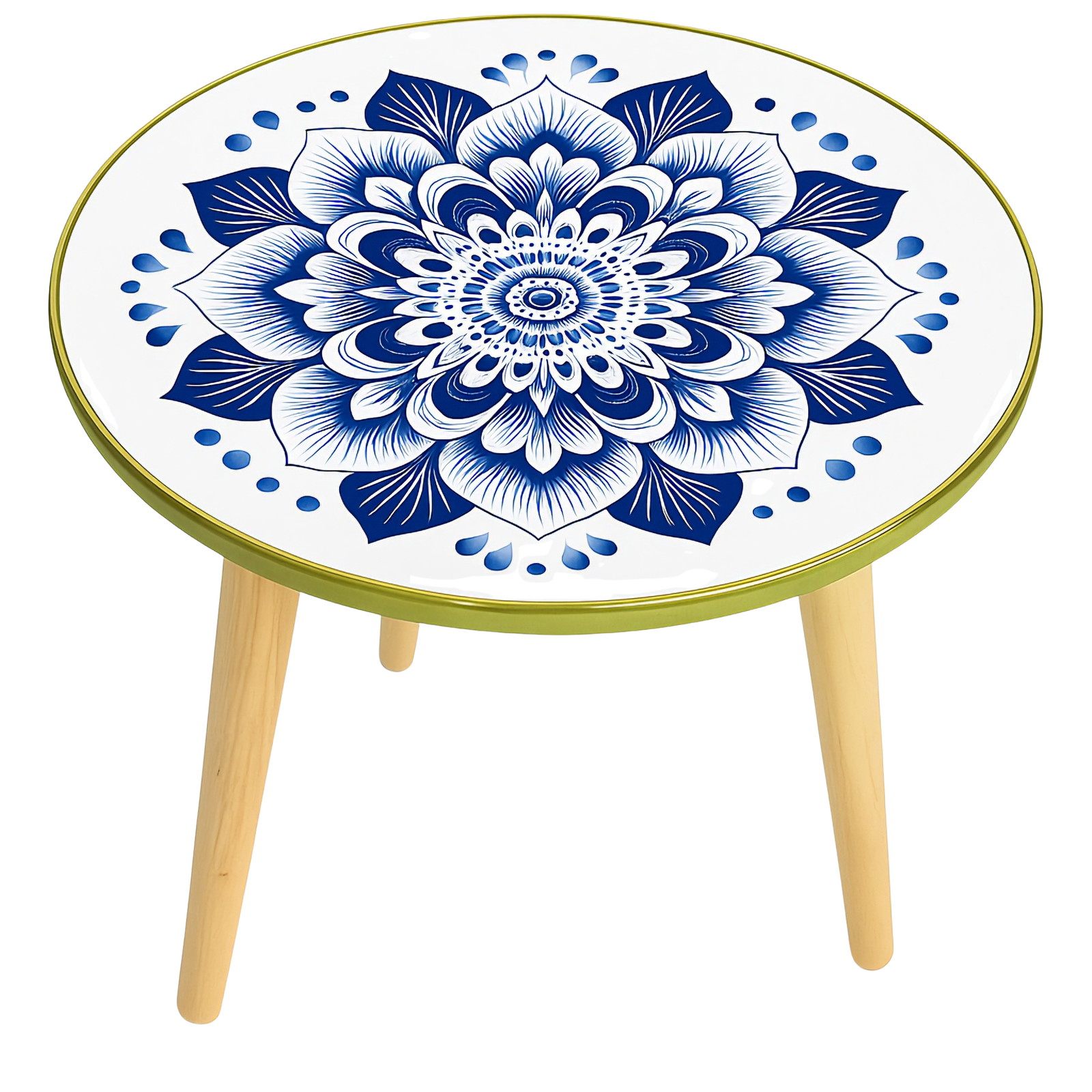 שולחן מנדלה עגול ומרהיב בעיצוב נקי, רגוע ומלא נוכחות, בהשראת פרח הלוטוס הפורח באור קריר של בוקר צפוני. העיטור הסימטרי בגווני כחול עמוק, תכלת ולבן-פנינה מעניק למרחב תחושת אוויר צלול בעוד שרגלי העץ הבהירות מוסיפות חמימות טבעית להרמוניה מושלמת. השולחן משתלב נהדר בעיצוב מודרני, סקנדינבי או בוהו-נקי, ומשדר שלווה, בהירות וטוהר בכל חלל.