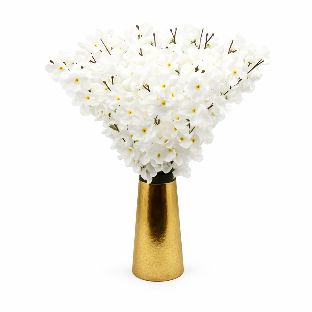 7 ענפי פריחת שקדיה אביבית לבנה בעיצוב טבעי ועדין. הפרחים הלבנים בעלי אבקנים צהובים פורחים בצפיפות על ענפים כהים, ויוצרים מראה נקי, טהור ורומנטי. עשויים מחומרים מלאכותיים איכותיים המדמים פריחה טבעית ורעננה – ללא צורך בתחזוקה או השקיה.