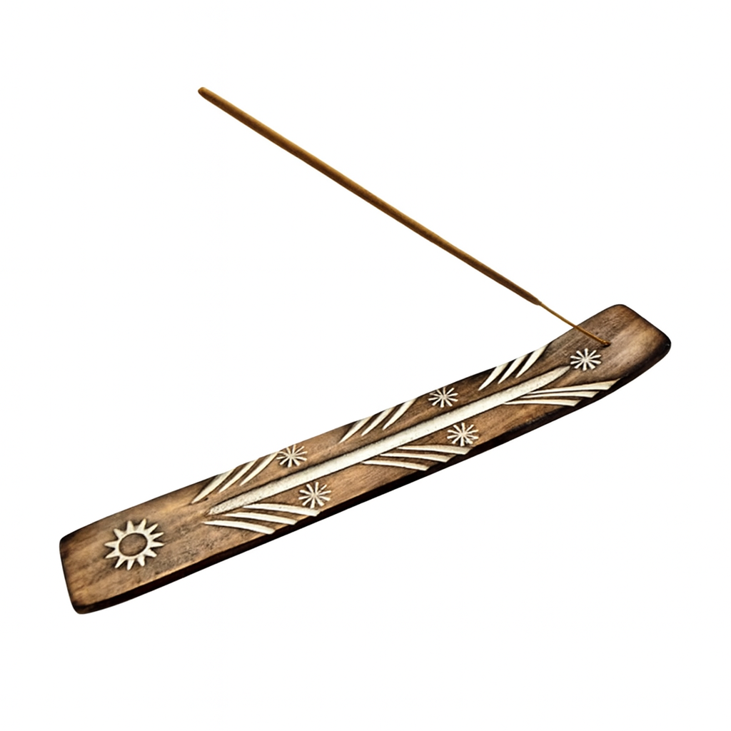 מחזיק קטורת מעץ טבעי בגוון חום עמוק, בעיצוב מרשים של שמש וכוכבים חרוטים ביד. הצורה המוארכת מאפשרת לקטורת להישרף בנוחות, תוך שמירה על ניקיון המשטח ואיסוף האפר בצורה מסודרת. הדוגמה האתנית מוסיפה נגיעה רוחנית, חמה ומסתורית — מושלם למדיטציה, יוגה, טיהור חללים ולעיצוב פינת קטורת מרגיעה בבית.