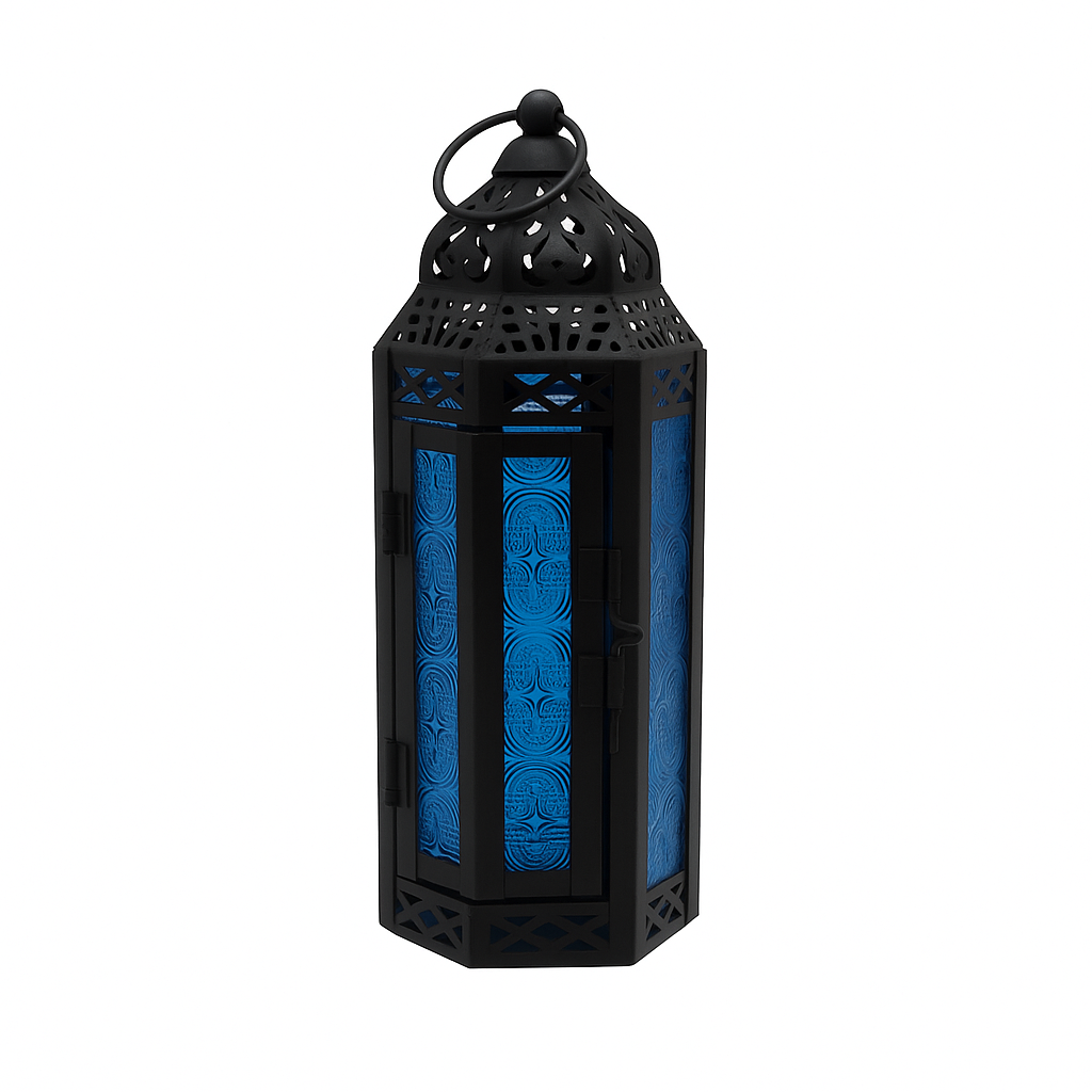 עששית מתכת גבוהה בעיצוב מזרחי אותנטי, עם חיתוכים עדינים ודפוסי תחרה במתכת שחורה. הזכוכיות הכחולות המעוטרות מפיצות אווירה מסתורית ומרגיעה המזכירה את סמטאות דמשק העתיקה. ניתן להציב בתוכה נר־תה, נר ריחני או נר לד – לתאורה רכה ורומנטית בבית, בגינה או במרפסת. פריט נוי קלאסי לחובבי עיצוב מזרחי ואור קסום.