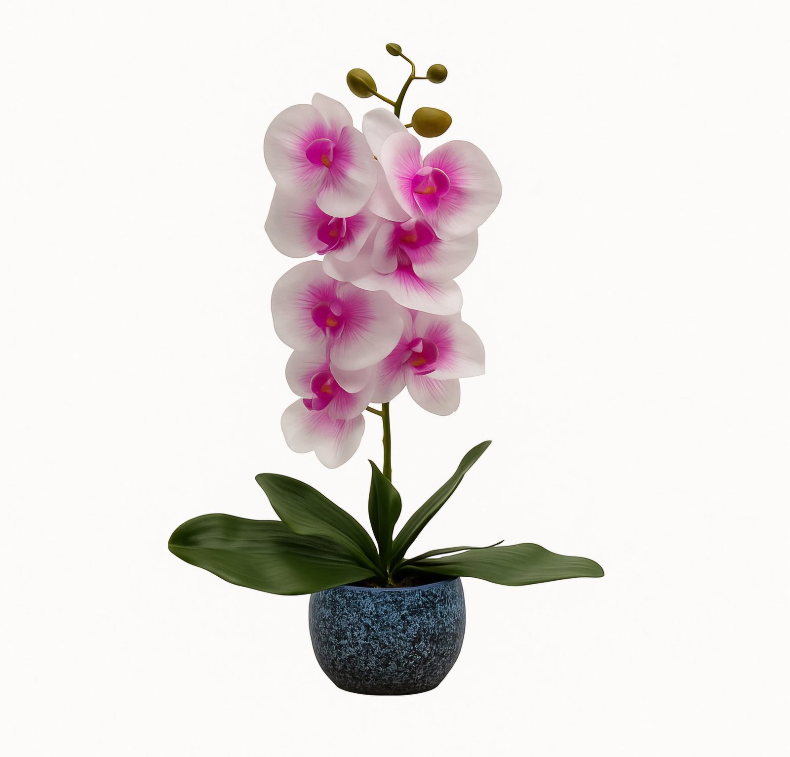 אורכידאה מלאכותית בגוון לבן עם מרכז ורוד עדין, בעיצוב אלגנטי ומודרני. הפריחה הרכה והעלים הירוקים יוצרים מראה טבעי והרמוני, והעציץ הכחול המעוצב מוסיף עומק וסטייל יוקרתי. ללא צורך בהשקיה או תחזוקה – יופי נצחי שנשמר תמיד ללא מאמץ. מושלם לעיצוב סלון, שידה, חדר שינה או משרד, ומעניק לכל חלל אווירה רגועה, מוארת ומלאת רוך.