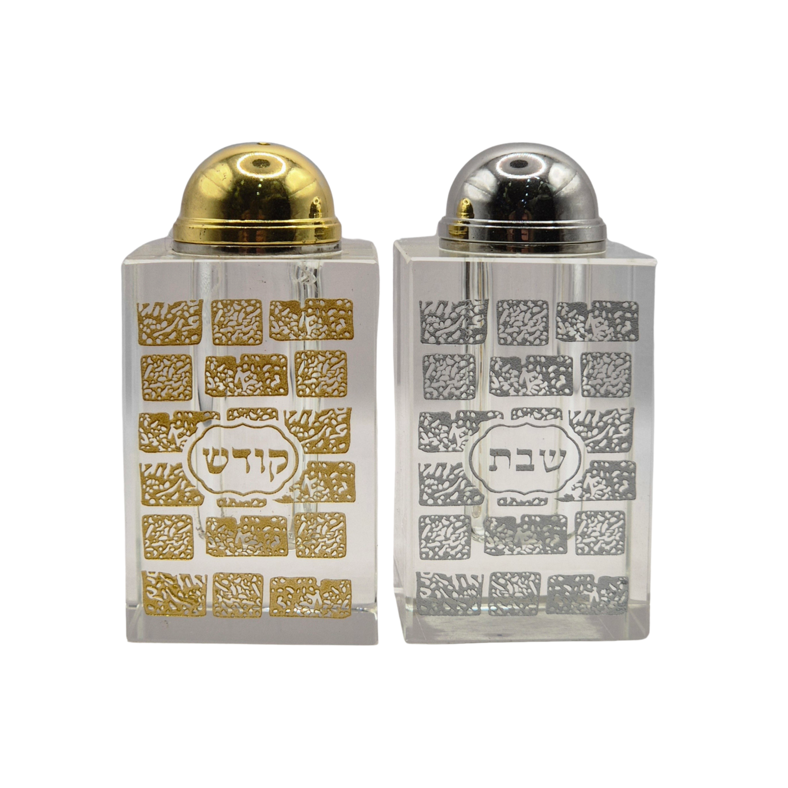 סט מלח ופלפל יוקרתי בעיצוב מודרני ומעודן, המשלב מסורת ואלגנטיות. עשוי זכוכית שקופה איכותית עם עיטורי “אבני הכותל” בחריטה זהובה וכסופה, ועליהן המלים שבת קודש. המכסים המטאליים – זהב וכסף – מוסיפים נגיעה של הדר ועיצוב מושלם לשולחן השבת. מושלם כמתנה יוקרתית לכל בית יהודי.
