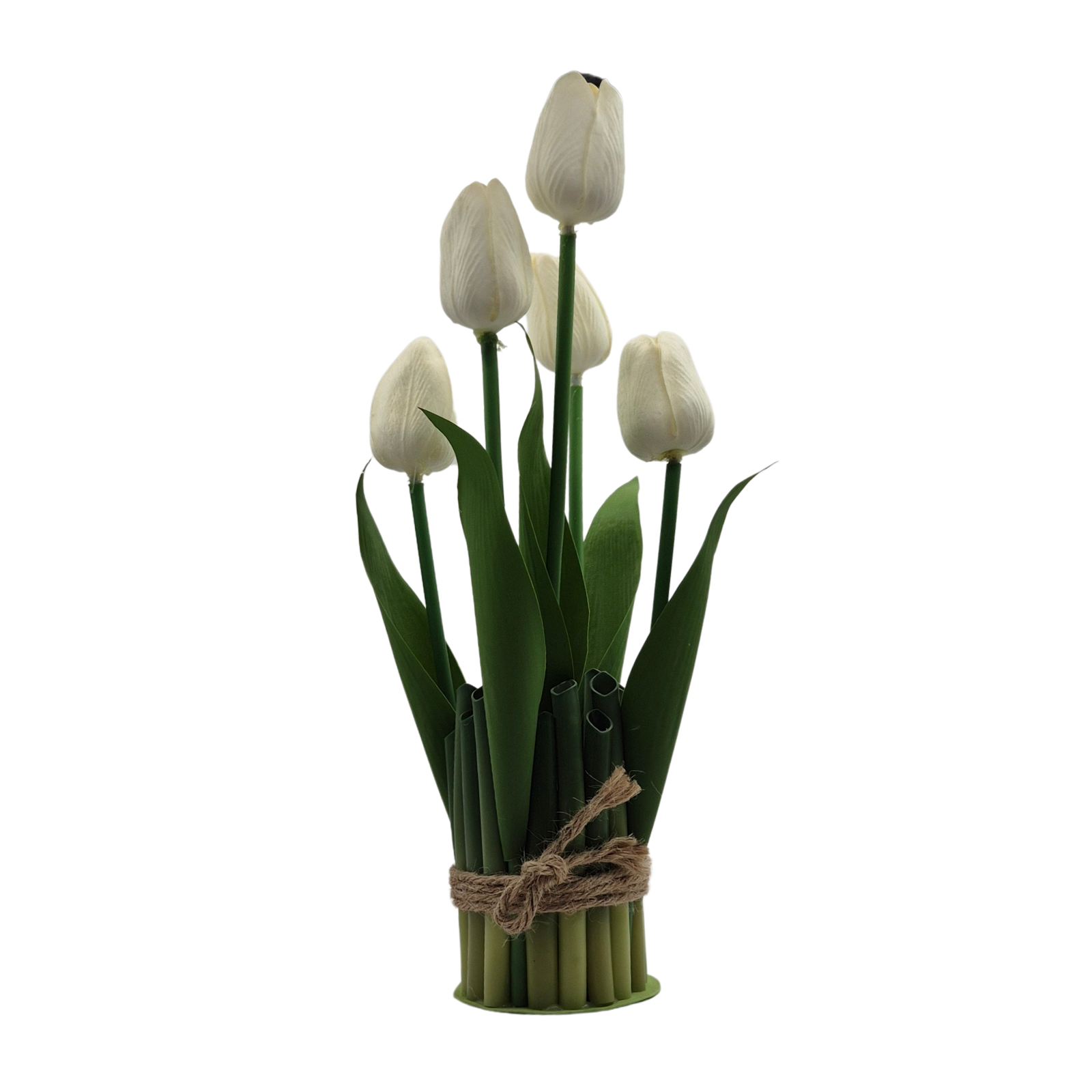 זר טוליפים לבן מלאכותי בעיצוב אלגנטי ונקי, המדמה מראה טבעי ומוסיף תחושת רוגע, אור והרמוניה לכל חלל. מתאים להנחה על שולחן, מדף, שידה או פינת אירוח, ומשתלב באופן מושלם בעיצוב מודרני, קלאסי או כפרי. פתרון אידיאלי לעיצוב הבית ללא צורך בתחזוקה, מים או אור, עם מראה דמוי פרחים אמיתיים הנשמר לאורך זמן.