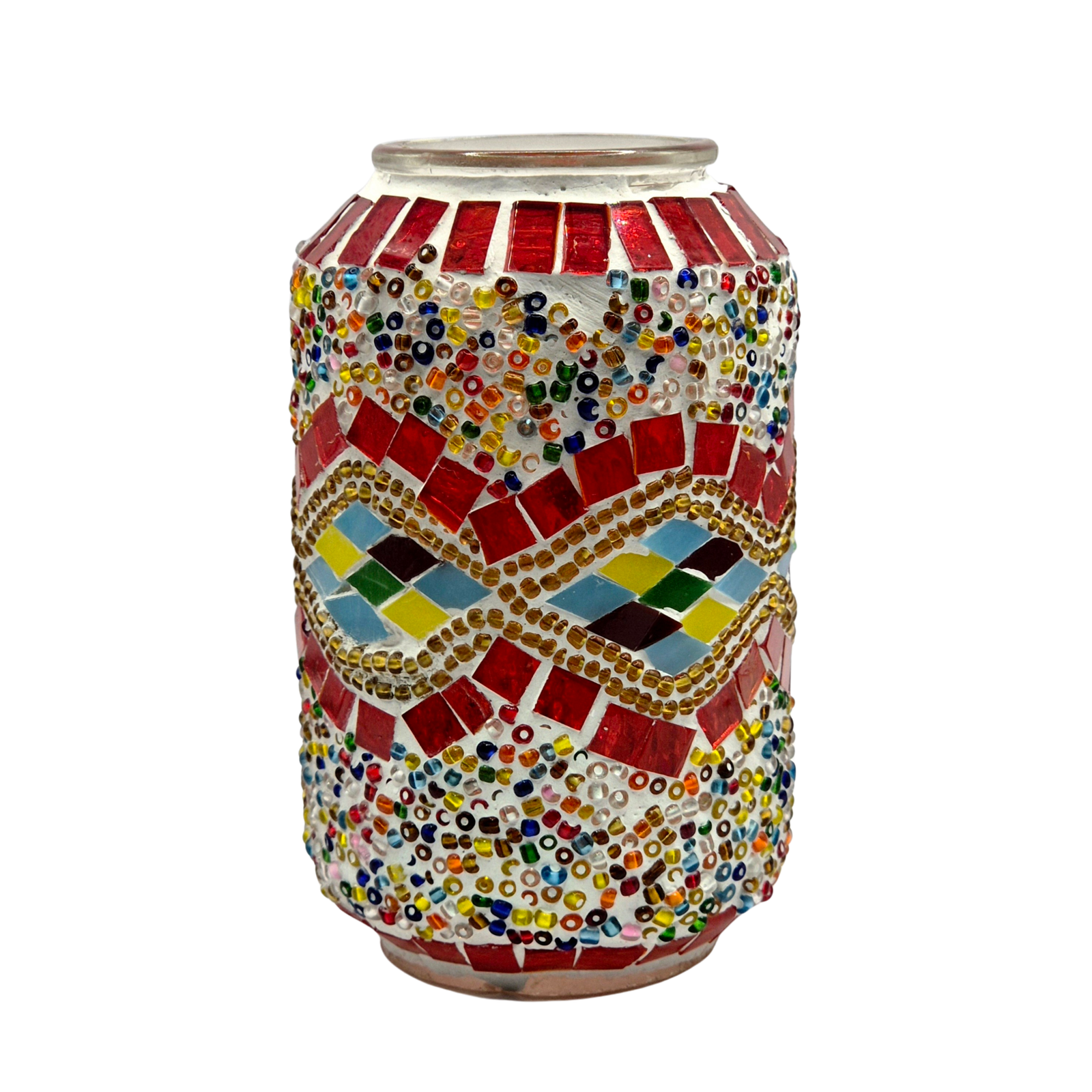 עששית זכוכית מרהיבה בעבודת יד, מצופה פסיפס צבעוני מלא חיים בגווני אדום, זהב, כחול וצהוב. כל רסיס זכוכית משובץ בקפידה ויוצר דוגמה גאומטרית ייחודית השוברת את האור ומפזרת אותו בזוהר קסום ומרגיע. האור המשתקף דרך האבנים הצבעוניות יוצר אווירה חמימה, רומנטית וחגיגית – מושלמת לשולחן ערב, לפינת ישיבה או לחלל המדיטציה הביתי. עששית שהיא גם פריט דקורטיבי אמנותי וגם מקור אור מלא נשמה.