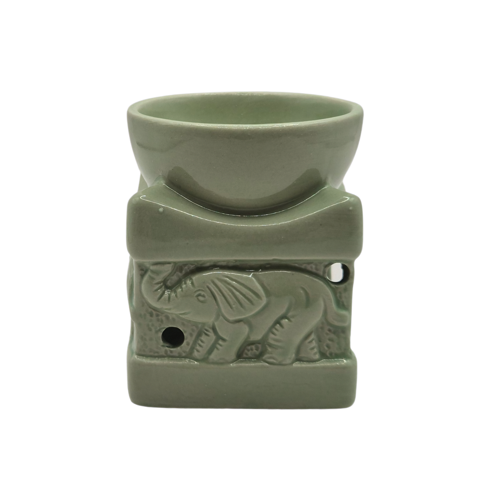 מבער שמנים ארומטי מקרמיקה בגוון ירוק מרווה, בעבודת יד ובגימור חלק ונעים. כולל קערה עליונה להנחת שמן ארומה או קוביית שעווה, ופתח אחורי ייעודי לנר חימום. הפיל נחשב בתרבויות רבות לסמל של מזל טוב, חוכמה, יציבות ושפע, ולכן מבער זה מתאים במיוחד ליצירת אווירה רגועה, נעימה ומבורכת בבית. מושלם לפינת מדיטציה, סלון, חדר שינה או כמתנה עם משמעות ואנרגיה טובה.