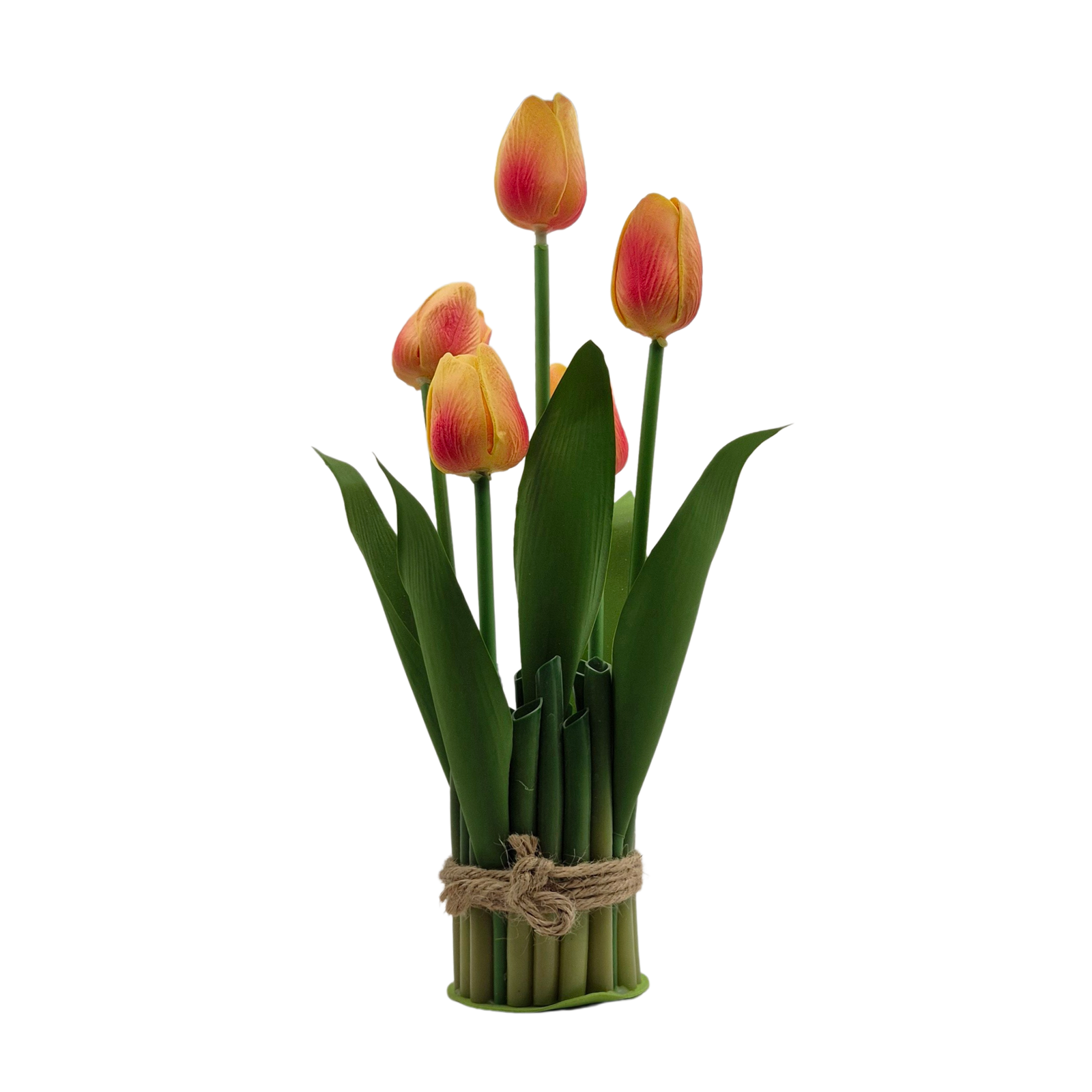 זר טוליפים מלאכותי בגווני צהוב־כתום חמים, בעיצוב טבעי ושמח המוסיף אור, רעננות וחיות לכל חלל. מתאים להנחה על שולחן, מדף, שידה או פינת אירוח, ומשתלב נהדר בעיצוב מודרני, כפרי או קלאסי. פתרון מושלם לעיצוב הבית ללא צורך בתחזוקה, מים או אור, עם מראה דמוי פרחים אמיתיים לאורך זמן.