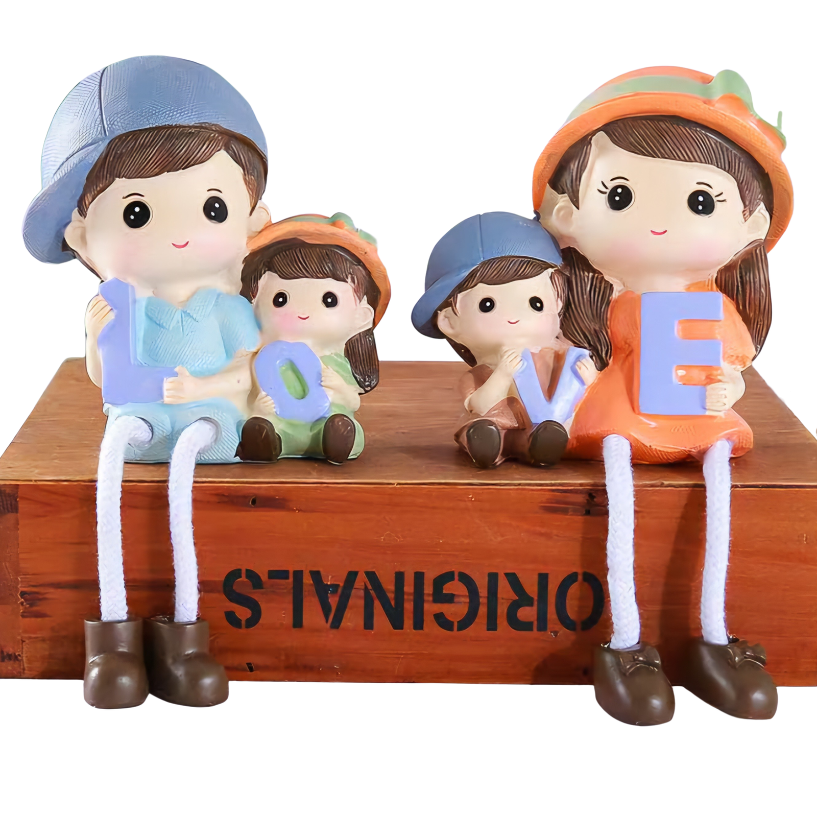 סט בובות דקורטיביות בעיצוב משפחתי מחמם לב – אב, אם ושני ילדים, כולם יושבים זה לצד זה כשבידיהם האותיות המרכיבות את המילה LOVE. הבובות עשויות שרף איכותי בצביעה עדינה של תכלת, כתום וירוק. מושלם לקישוט סלון, חדר ילדים או חדר שינה, או כמתנה ליום האהבה, ליום נישואין, ללידה או לחנוכת בית.