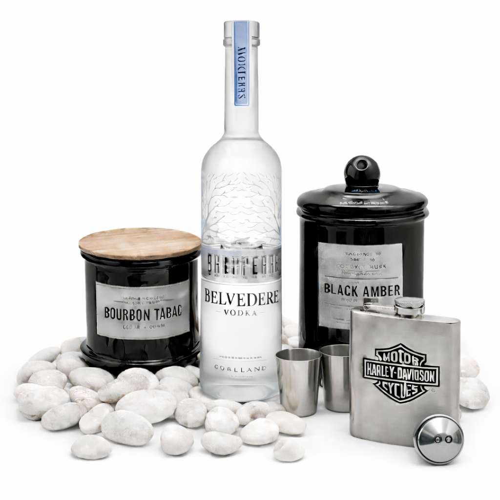 מארז מתנה גברי עשיר ומרשים, הכולל בקבוק וודקה איכותית בסגנון פרימיום, בקבוק אלכוהול שטוח מנירוסטה בעיצוב אייקוני, כוסיות תואמות ושני נרות ריחניים: Black Amber ו־Bourbon Tabac, המוסיפים עומק, חמימות ואווירה גברית אלגנטית. השילוב בין אלכוהול יוקרתי, ניחוח חמים וסטייל גברי יוצר מארז עם נוכחות ברורה ואופי מובחן. מושלם כמתנה לאירועים מיוחדים, לבית, למשרד או לחדר עבודה.