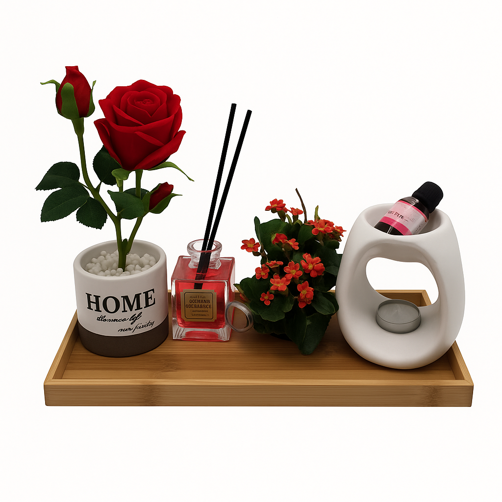 מארז מתנה יוקרתי ומלא תשוקה לעיצוב הבית, הכולל מבער קרמיקה לבן לשמנים אתריים, בקבוקון שמן רוז טבעי, מפיץ ריח בניחוח ורדים ואדום רומנטי, ורד אדום בעציץ קרמי “HOME” ותוספת פרחים דקורטיביים בגוון אדמדם. כל האלמנטים מסודרים בהרמוניה על מגש במבוק טבעי, ליצירת אווירה חמה, ריחנית ומזמינה. מושלם כמתנה רומנטית ליום אהבה, לחנוכת בית, לחג או לפינוק אישי מלא ריח, יופי וסטייל.
