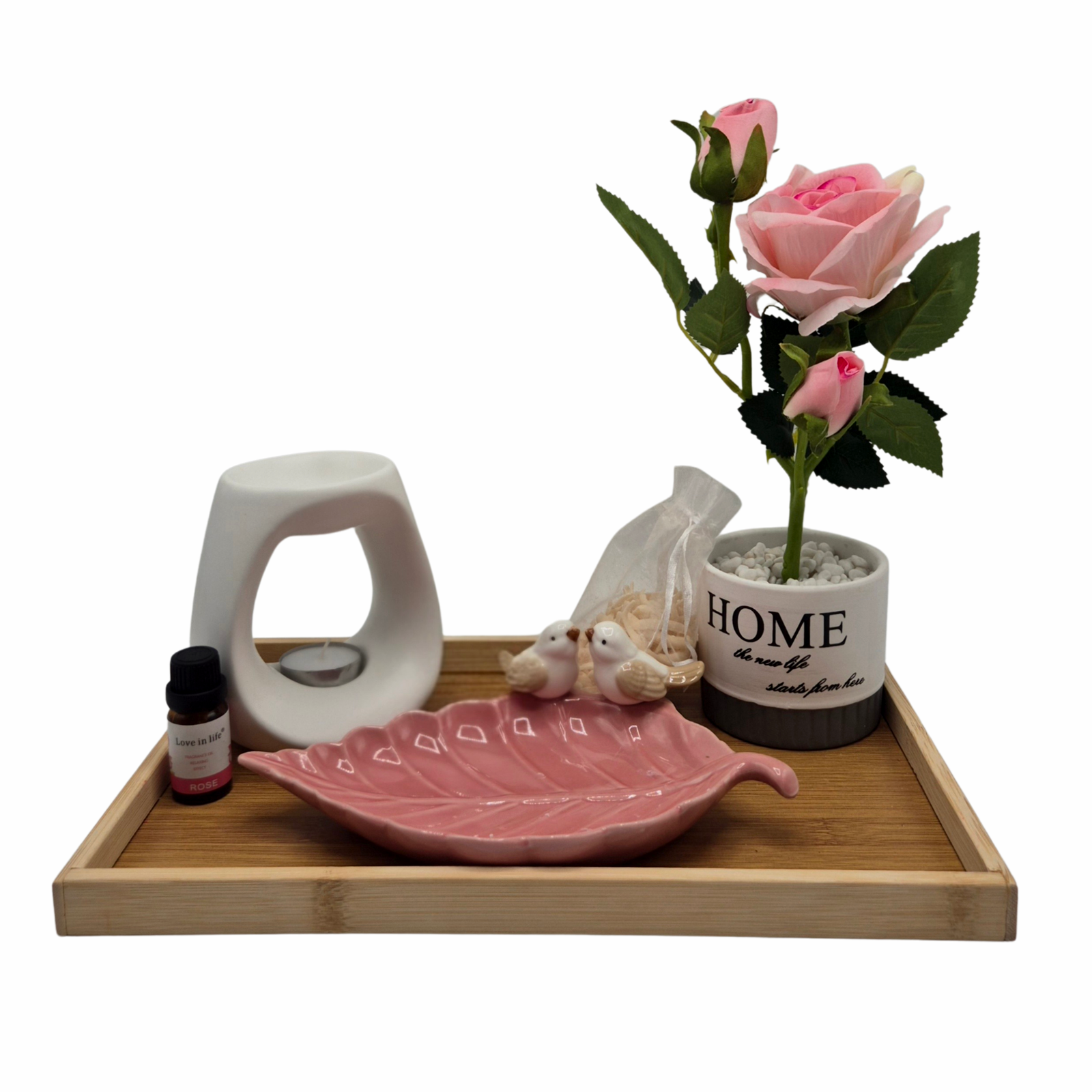 מארז מתנה יוקרתי לעיצוב הבית, הכולל מבער קרמיקה לבן לשמנים אתריים, בקבוקון שמן רוז טבעי, קערית עלה דקורטיבית ורודה עם זוג ציפורים קרמיות עדינות – המשמשת כקערית להנחת סבון ריחני בחדר האמבטיה או המטבח, ורד ורוד בעציץ קרמי “HOME” ושקיק שבבי סבון עם ריח ממכר. כל האלמנטים מסודרים בהרמוניה על מגש במבוק טבעי. המארז משלב ריח, עיצוב וטבע – ויוצר אווירה של אהבה, ניקיון והרמוניה בכל חלל. מושלם כמתנה לחנוכת בית, יום הולדת, חג, יום אהבה או לפינוק עצמי מלא רוגע וסטייל.