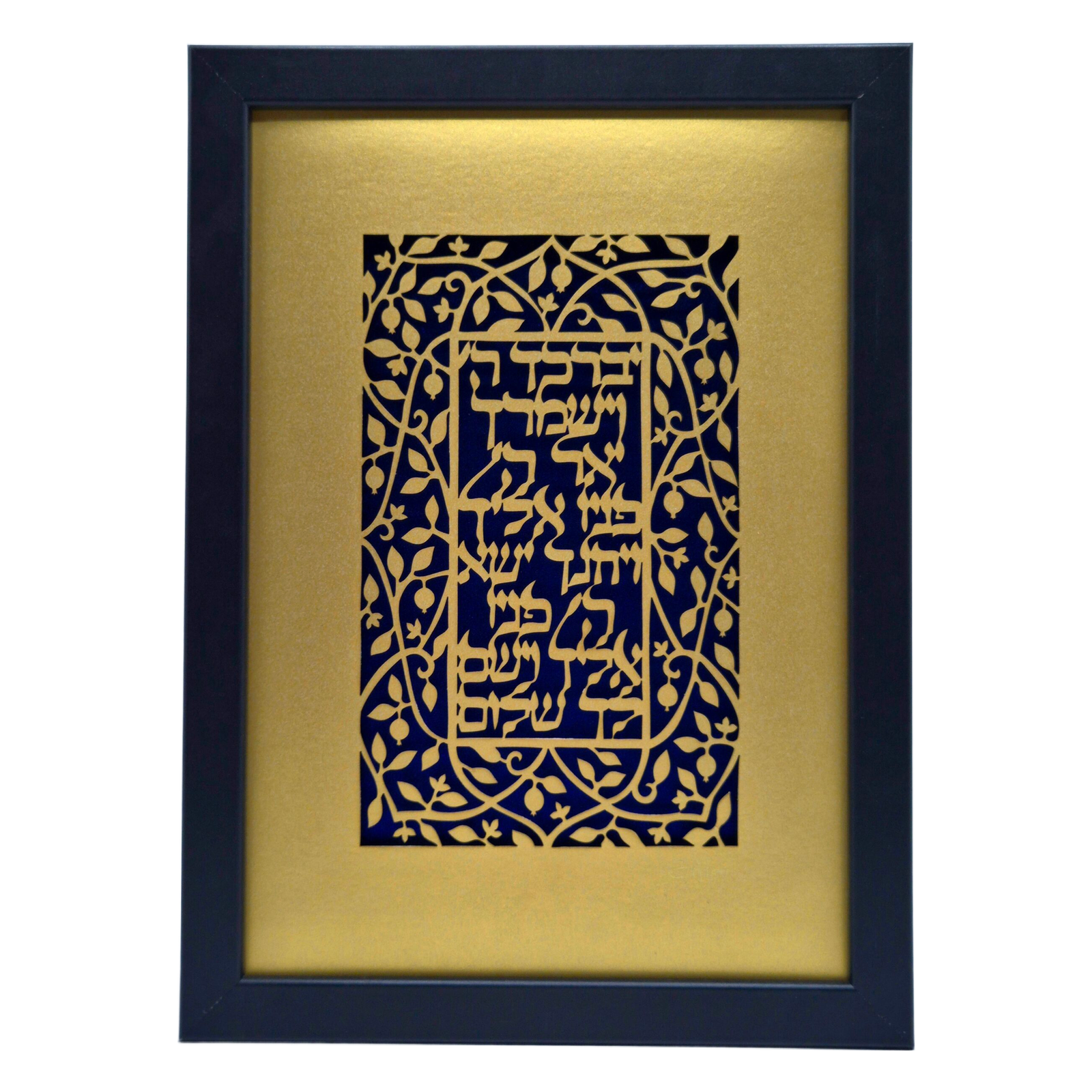 תמונת קיר מרהיבה בעבודת חיתוך לייזר זהוב על רקע בד בגוון כחול עמוק, המציגה ברכת כהנים בעיצוב מסורתי עשיר. המסגרת השחורה המדויקת והדגמים הפרחוניים המקיפים את הטקסט יוצרים יצירה מלאת הוד, שמירה וברכה. שילוב הזהב הבוהק עם הכחול העמוק מעניק ליצירה נוכחות מרשימה ואצילית, מושלמת לסלון, לפינת משפחה, למבואה או כמתנה מהודרת לבר מצווה, חתונה וחנוכת בית.