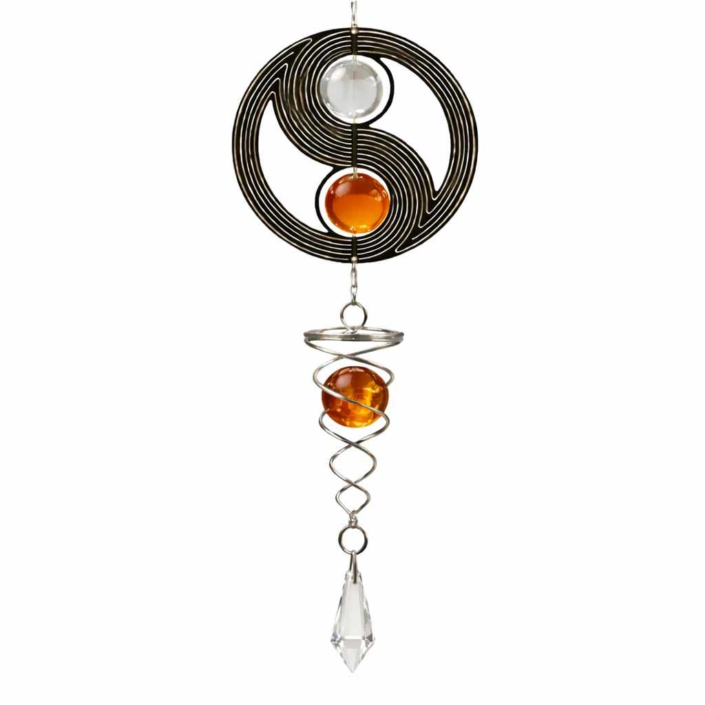 מובייל תלייה דקורטיבי עשוי מתכת בגימור כסוף, בעיצוב יין-יאנג – סמל עתיק לאיזון, הרמוניה וזרימה מתמדת בין כוחות משלימים. במובייל משולבים קריסטל שקוף ושני קריסטלים בצבע ענבר המעניקים נוכחות רכה, חמימה ועוטפת. תנועתו הסיבובית עם זרימת האוויר יוצרת משחקי אור עדינים ומשרה תחושת איזון, הרמוניה ורוגע. מתאים לתלייה בבית, במרפסת מקורה, ליד חלון או בפינת מדיטציה, ומשלב עיצוב אסתטי עם משמעות רוחנית.