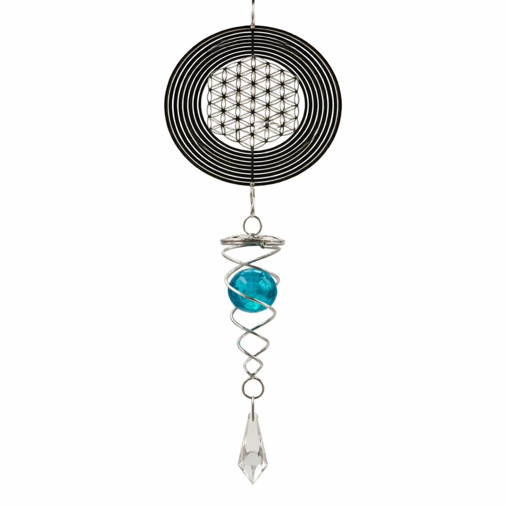 מובייל רוח דקורטיבי עשוי מתכת בגימור כסוף, בעיצוב פרח החיים – סמל גאומטרי עתיק המייצג הרמוניה, שלמות וזרימת אנרגיה בין גוף, נפש ותודעה. במרכז המובייל משולב קריסטל בצבע טורקיז המוסיף נוכחות אנרגטית, חיות ועומק חזותי. תנועתו הסיבובית עם זרימת האוויר יוצרת משחקי אור עדינים ואווירה מאוזנת ומרגיעה. מתאים לתלייה בבית, במרפסת מקורה, ליד חלון או בפינת מדיטציה ורוגע, ומשלב עיצוב אסתטי עם משמעות רוחנית.
