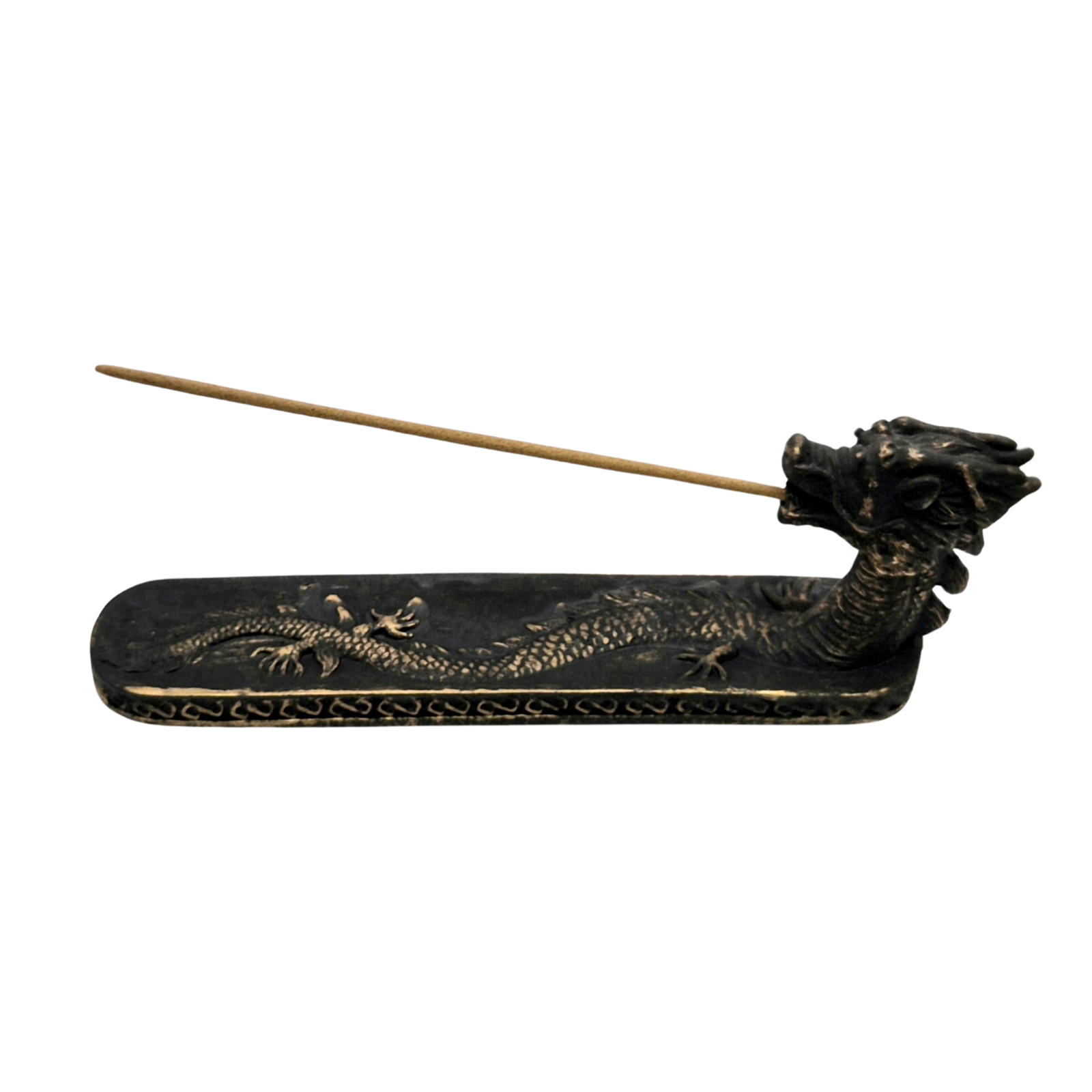 מעמד קטורת בעיצוב דרקון מרהיב, עשוי חומר יצוק בגוון שחור עם נגיעות זהב עתיק. הדרקון הפיסולי נפרס לאורך בסיס המעמד ומחזיק את מקל הקטורת בפיו, בסגנון המזכיר אמנות מזרחית מסורתית. פריט דקורטיבי מרשים שמוסיף נוכחות מסתורית לכל חלל, ומתאים לשימוש עם קטורות ריחניות או כאלמנט עיצובי בפני עצמו. מושלם למדיטציה, טיהור חללים או פשוט ליצירת אווירה קסומה ומסתורית בבית.