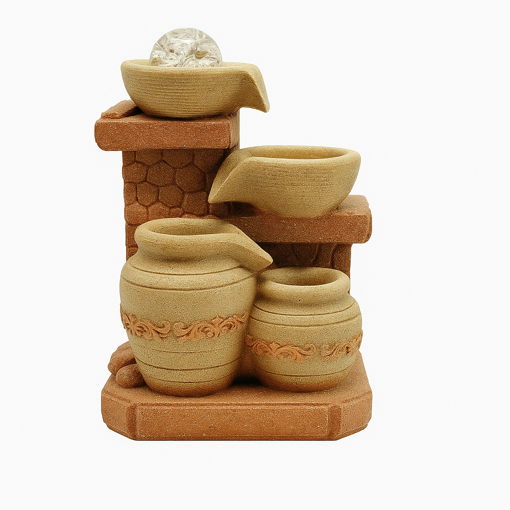 מזרקת מים שולחנית בעיצוב טבעי, המדמה זרימה רכה בין כדיי חמר המדורגים זה מעל זה, כאילו נובעים ממעיין קטן בלב הטבע. המים נעים ברכות ויוצרים צליל פכפוך מרגיע, בעוד כדור הקריסטל העליון מסתובב ומפיץ אור רך ומרגיע. המראה החולי משתלב בכל סגנון עיצוב – כפרי, בוהו או מודרני – ומוסיף נופך חמים ומזמין לבית, למשרד או לפינת מדיטציה.