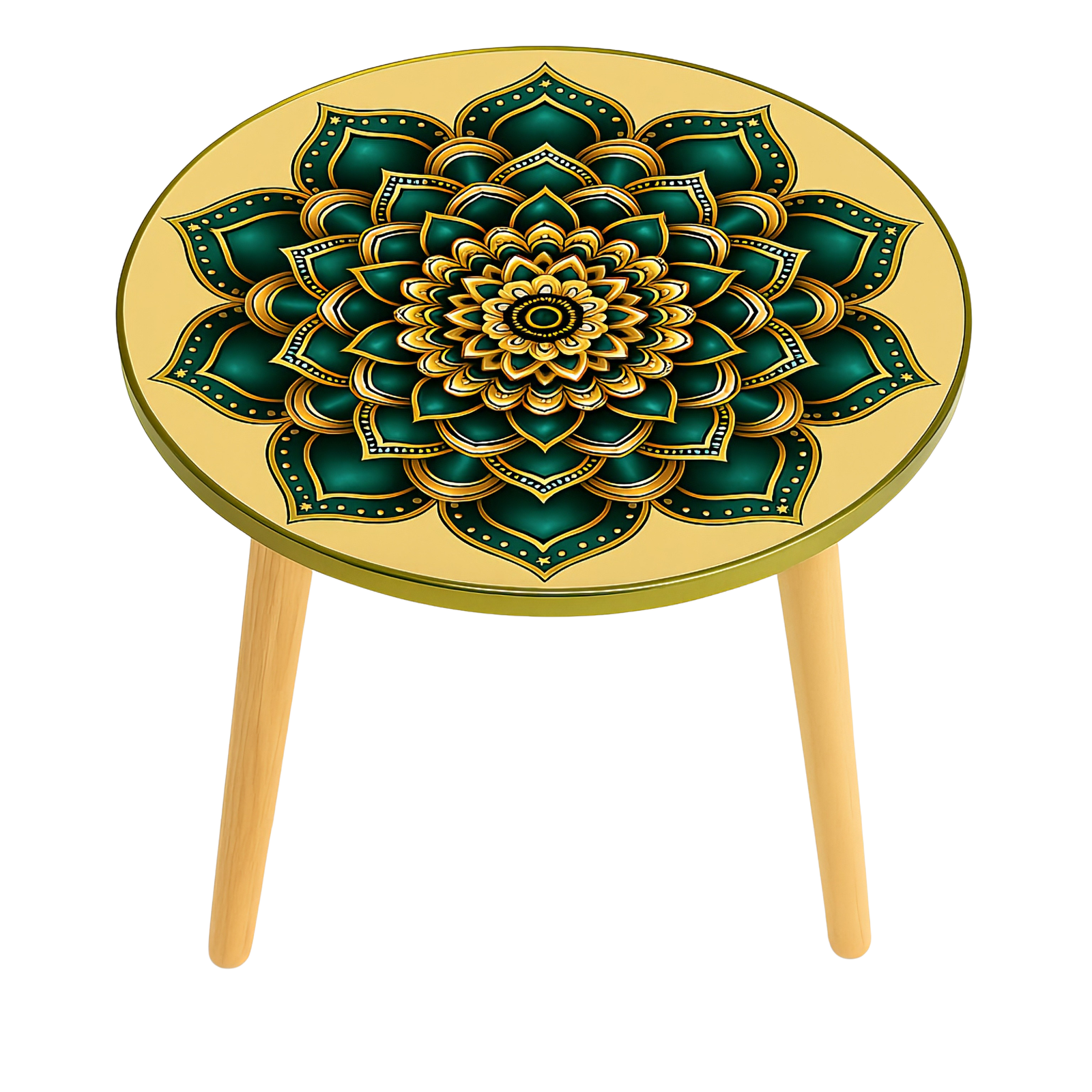 שולחן מנדלה עגול ומרשים בעיצוב בהשראת פרח הלוטוס, סמל עתיק להרמוניה, טוהר והתחדשות. העיטור הסימטרי בגווני ירוק-אזמרגד וזהב מעניק לכל חלל תחושה של שלווה יוקרתית בעוד שרגלי העץ הבהירות מוסיפות חמימות טבעית. משמש כשולחן קפה או כפריט דקורטיבי מושלם לסלון, לפינת ישיבה או לחדר מדיטציה ומשתלב נהדר בעיצוב טבעי, בוהו או מודרני.
