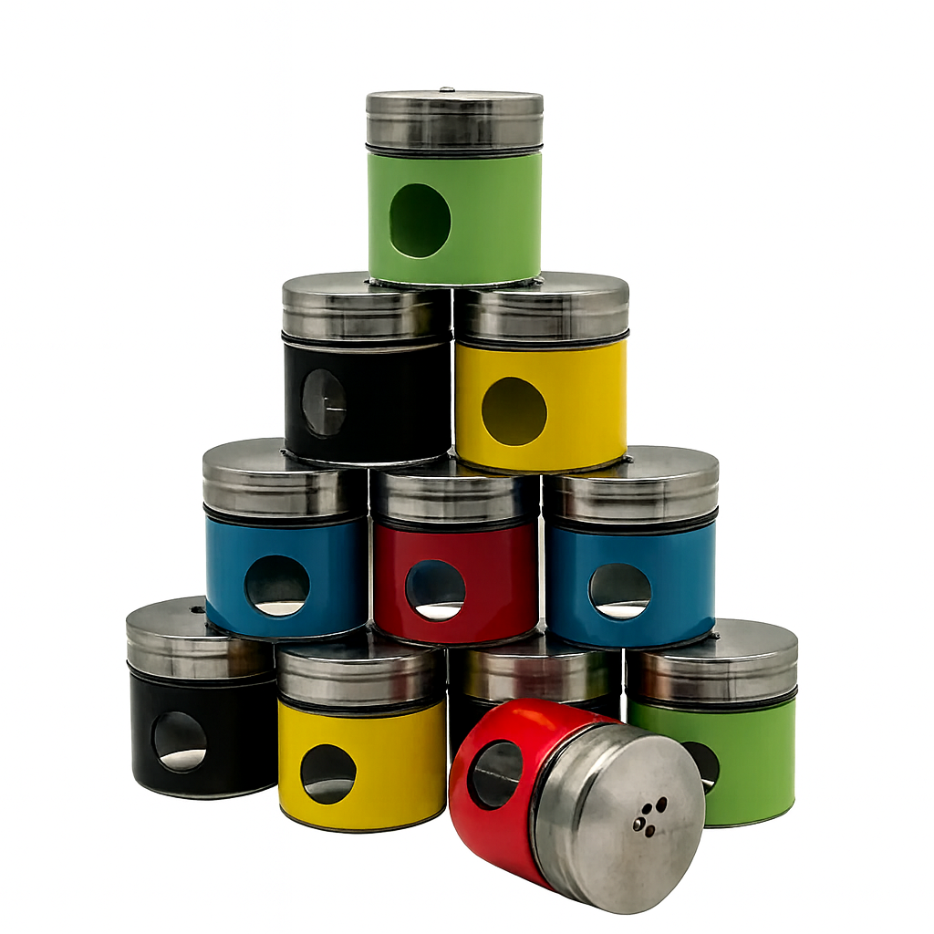 סט מעוצב של 10 קופסאות תבלינים צבעוניות עשויות נירוסטה איכותית, בשילוב חלון זכוכית שקוף המאפשר לראות את התכולה בקלות. לכל קופסה מכסה מתכוונן לפיזור מדויק ונוח של תבלינים, עשבי תיבול או אבקות בישול. הסט מוסיף חיים, סדר ואלגנטיות לכל מטבח – פרקטי לשימוש יומיומי וגם כפריט עיצובי מרשים למדף התבלינים. אידיאלי גם כמתנה מקורית לחובבי בישול ואירוח.