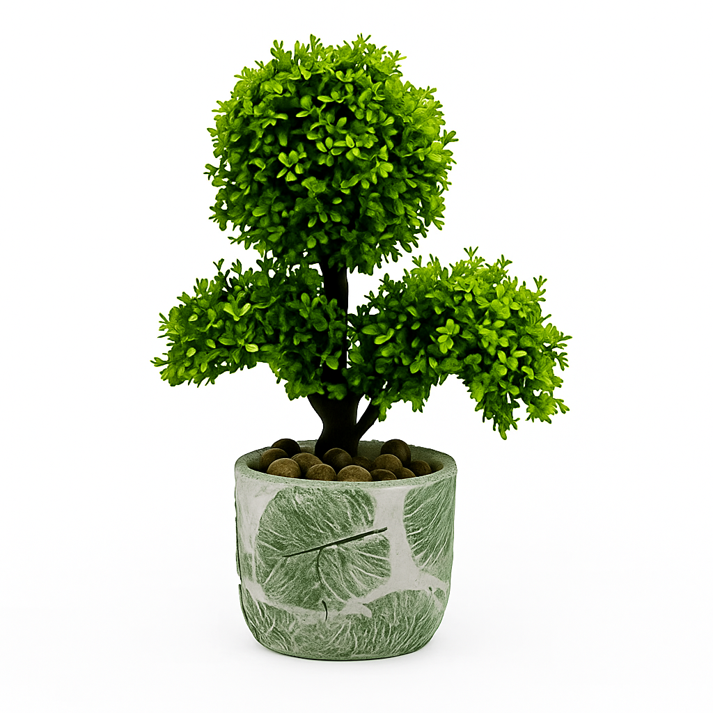 עץ בונסאי מלאכותי מעוצב בדייקנות, בעל נוף ירוק עשיר ומראה טבעי. העציץ המעוטר בדוגמת עלים מוסיף נגיעה אומנותית ועדינה המשתלבת בכל סגנון עיצוב.