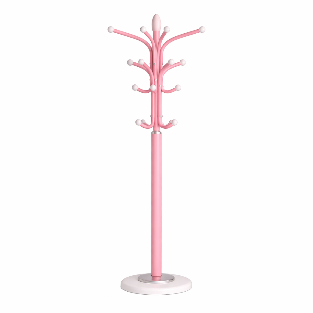 מתלה עומד בגוון ורוד עדין, בעיצוב קלאסי עם קווים רכים. עשוי ממתכת צבועה בתנור, בגימור חלק ואחיד. מוסיף נגיעה רומנטית ושמחה לחלל, ומתאים במיוחד לחדר שינה, חדר ילדים, סטודיו או פינת כניסה מעוצבת.