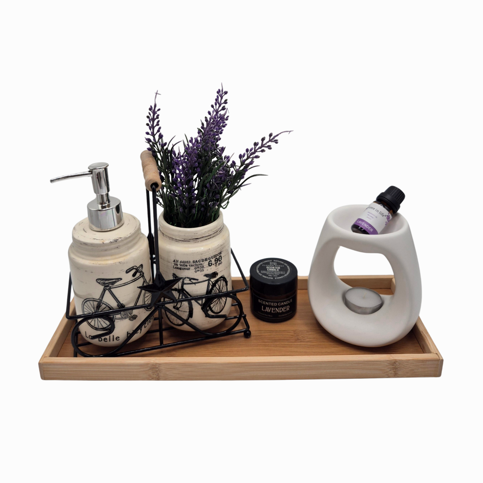 מארז מתנה יוקרתי לעיצוב הבית, הכולל מבער קרמיקה לבן לשמנים אתריים, בקבוקון שמן לבנדר טבעי, נר לבנדר ריחני, צמד כלי קרמיקה בעיצוב כפרי במעמד מתכת דקורטיבי בצורת אופניים – האחד למתקן סבון והשני לכלי אמבטיה או סכו"ם וענף לבנדר מלאכותי לקישוט. כל הפריטים מסודרים בהרמוניה על מגש במבוק טבעי. המארז משלב ריח, עיצוב וטבע – ויוצר תחושת ניקיון, רוגע והרמוניה מושלמת בבית. מושלם כמתנה לחנוכת בית, יום הולדת, חג, או כפינוק אישי מלא ריח ושלווה.