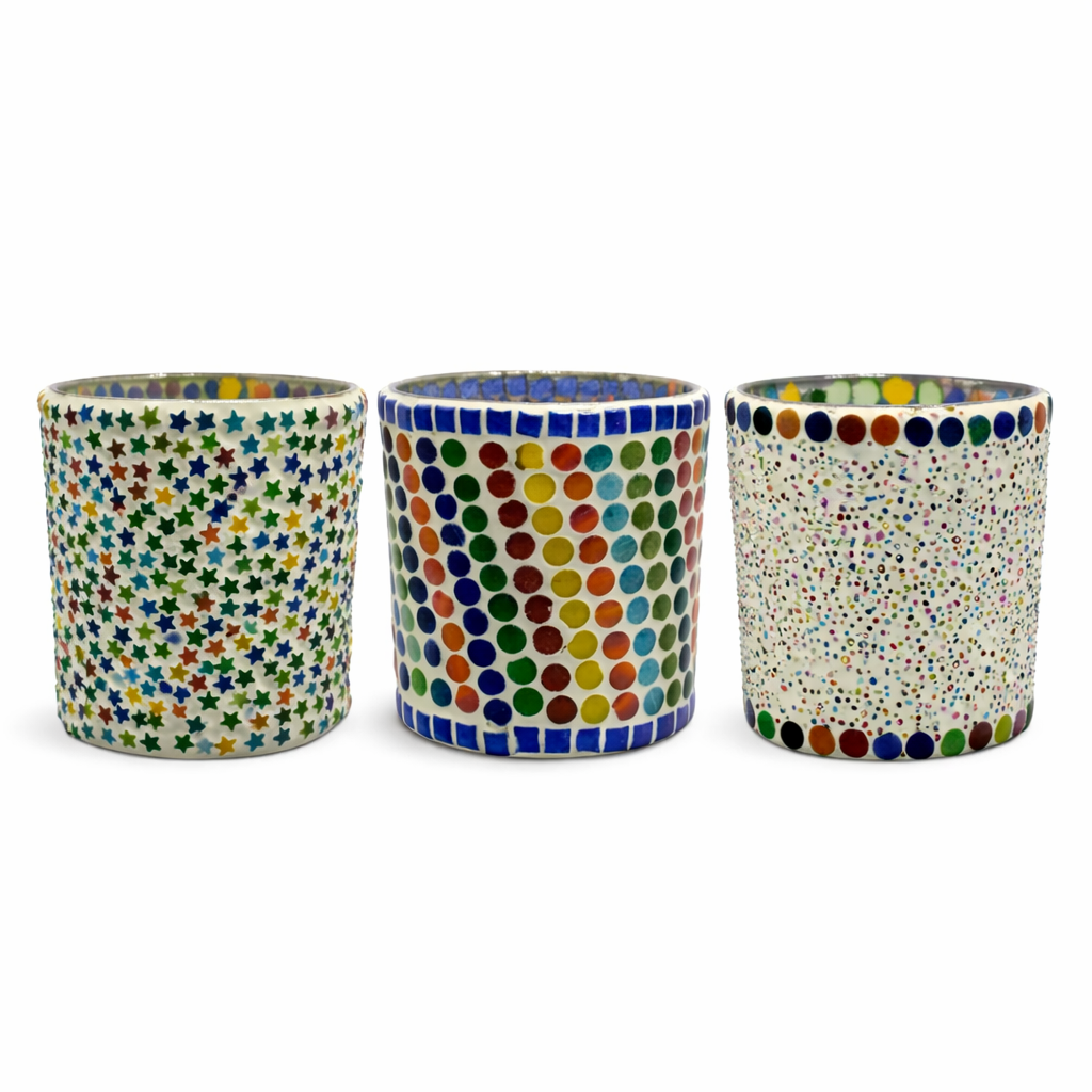 סט מחזיקי נרות דקורטיביים בעבודת פסיפס צבעונית, הכולל שלושה כלים בעיטורים שונים של עיגולים, נקודות וכוכבים בגוונים חיים ושמחים. הסט מפיץ אור רך ואווירה חמה, ומתאים לנרות או כפריט נוי בפני עצמו. משתלב בעיצוב בוהו, אקלקטי, אומנותי או צבעוני, ומוסיף אופי ושמחת חיים לכל חלל.