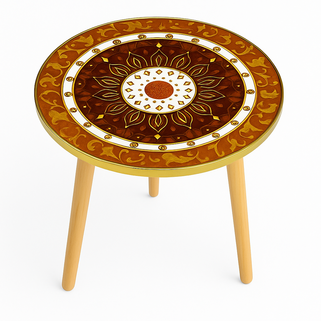 שולחן מנדלה מרהיב בהשראת מקדשי השמש הקדומים של הודו ותרבות המזרח. העיטור הסימטרי בגווני זהב, נחושת וכתום-ענברי מקרין אנרגיה חמה, חיובית ומלאת עוצמה, המזכירה את קרני השמש בשעת שקיעה מדברית. רגלי העץ הבהירות מאזנות את העושר הצבעוני ומעניקות נגיעה טבעית להרמוניה מושלמת.