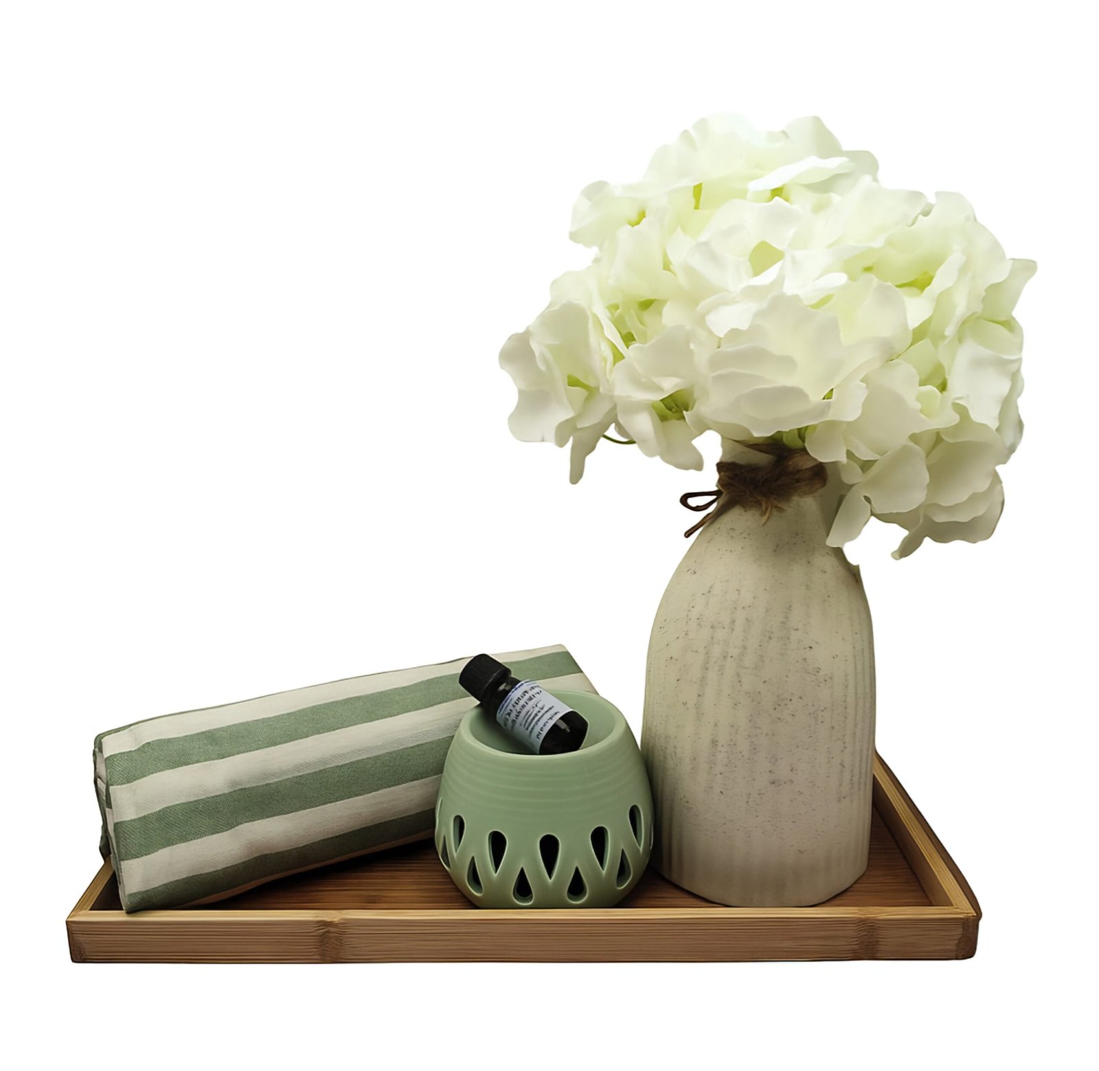 מארז מתנה בעיצוב טבעי, רך ואלגנטי, המשדר ניקיון ושלווה. כולל אגרטל קרמי בגוון שמנת עם פרחי הידרנג’ה מלאכותיים בגוון לבן, מבער קרמי בגוון ירוק מרווה, שמן ארומטי טבעי, ולונגי נעים למגע בגווני ירוק ולבן – כולם מוצגים על מגש במבוק טבעי המעניק חמימות ורוגע לעיצוב. המארז מושלם לחדר רחצה, חדר שינה או כפריט נוי לכל פינה בבית. מתאים כמתנה לחנוכת בית, יום הולדת, חג או לפינוק עצמי באווירה טבעית ושלווה.
