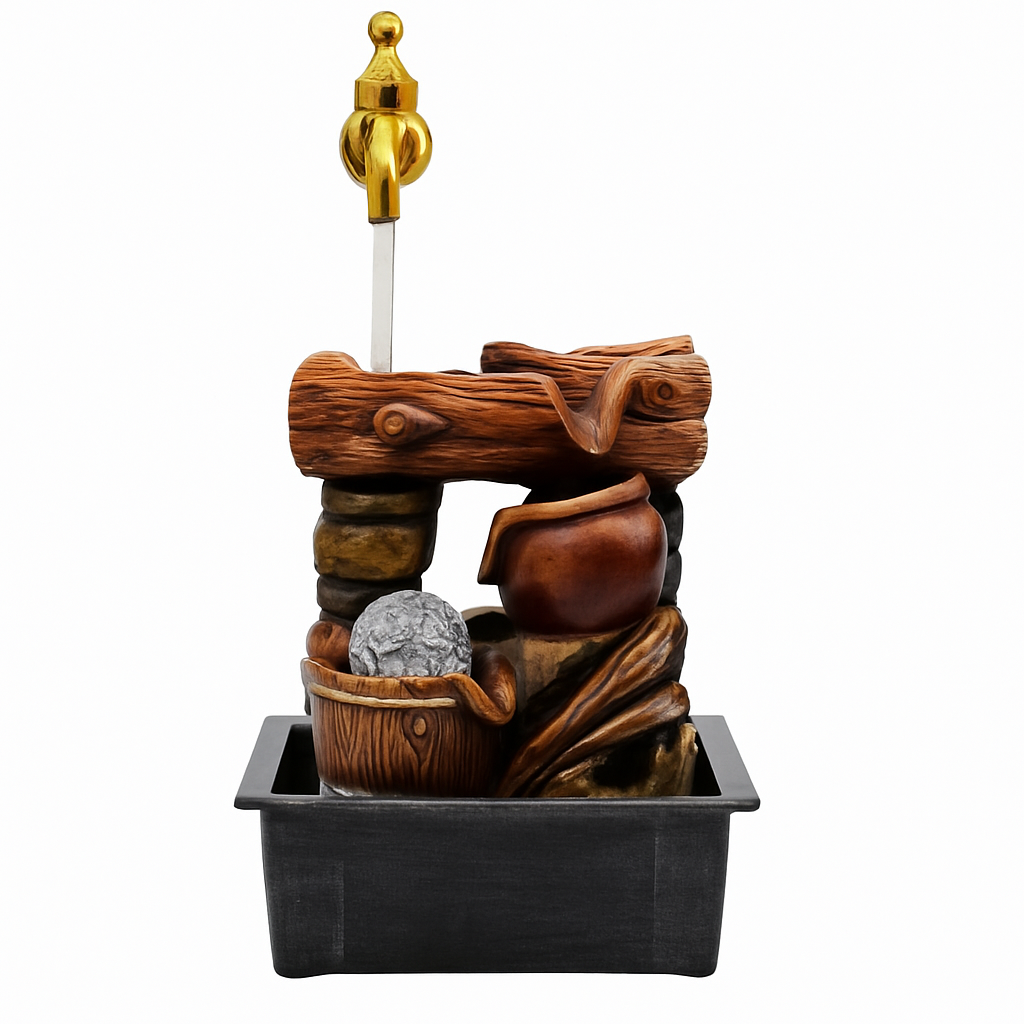 מזרקת מים דקורטיבית בעיצוב טבעי עם ניחוח כפרי עתיק. המים נובעים מברז זהב מרחף וזורמים ברוך מעל בולי עץ קטנים אל כד חרס חום ואל קערת אבן עם כדור מואר המסתובב בה ללא הפסקה. השילוב בין העץ, החרס והאור יוצר תחושת רוגע, חיבור לטבע וזרימה הרמונית שמרגיעה את הנפש. מזרקה זו מוסיפה חמימות ואלגנטיות לכל פינה בבית או במשרד, ומתאימה במיוחד לפינות מדיטציה, סלון או שולחן עבודה.