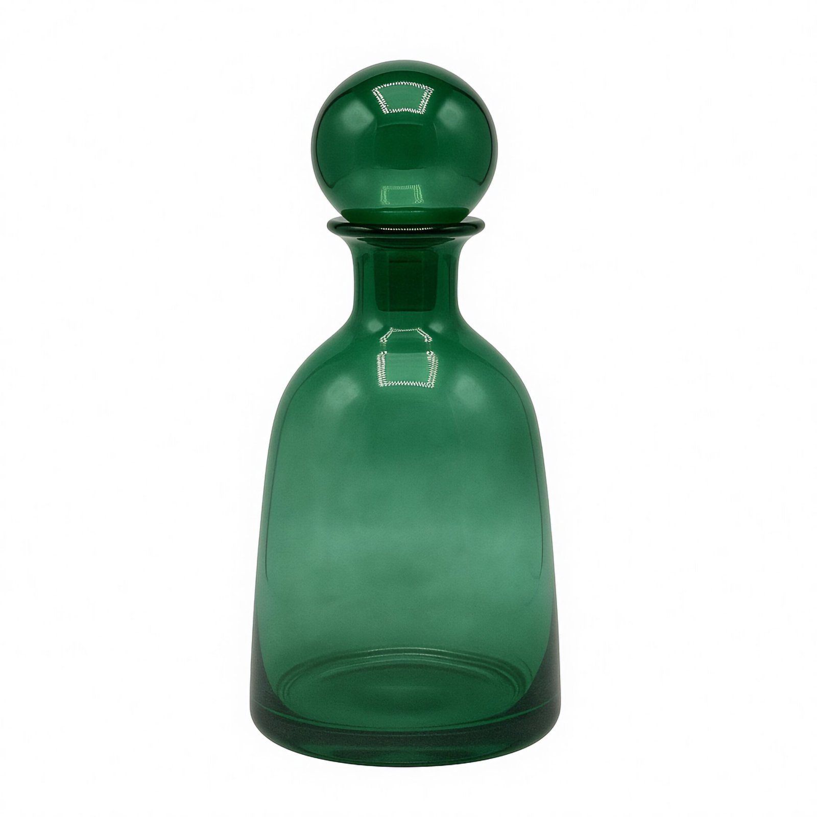 " דקנטר זכוכית מרהיב בגוון ירוק אזמרגד עמוק, עם פקק כדורי תואם ונוכחות יוקרתית. מיועד למזיגה ולאחסון של יין, וויסקי, ליקר או כל משקה אלכוהולי אחר. . מושלם לפינת בר, מדף ספרים או שולחן אוכל קלאסי, ומוסיף חמימות טבעית ונגיעה של אצילות מלכותית לכל חלל.