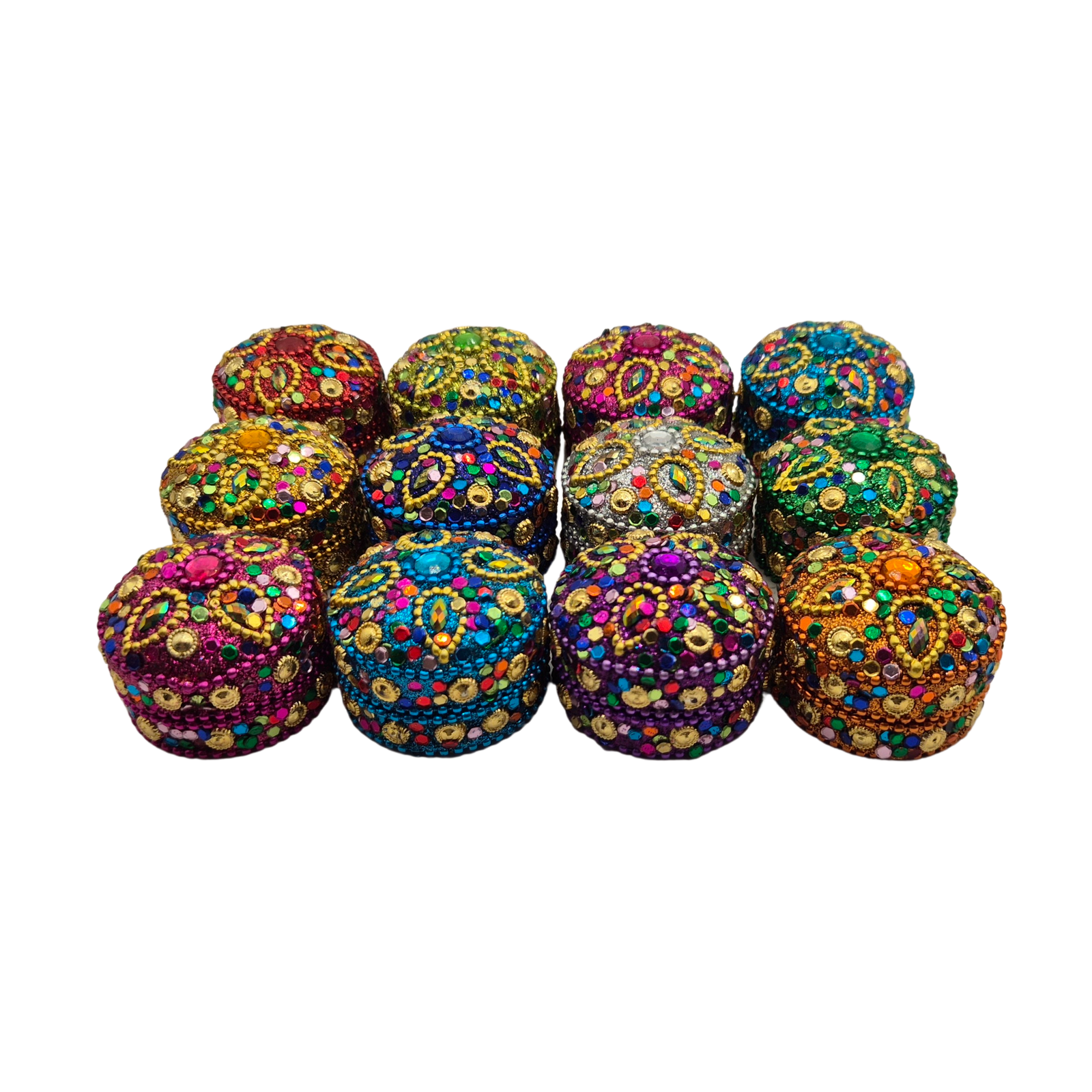 מארז יוקרתי של 12 קופסאות תכשיטים צבעוניות ומעוטרות בעבודת יד בסגנון הודי. כל קופסה מקושטת באבנים, חרוזים ונצנצים המייצרים מראה מרהיב, חגיגי ורב־צבעים. מתאים לשימוש כתיבת תכשיטים קטנה, לאחסון טבעות, עגילים או חפצים קטנים, וכן כמתנה מושלמת לאירועים, מסיבות, חלוקת מתנות, ללקוחות או כפריט נוי צבעוני ומלא חיים. מושלם להוספת טאץ' אקזוטי, אוריינטלי ומלא ברק לכל חלל.