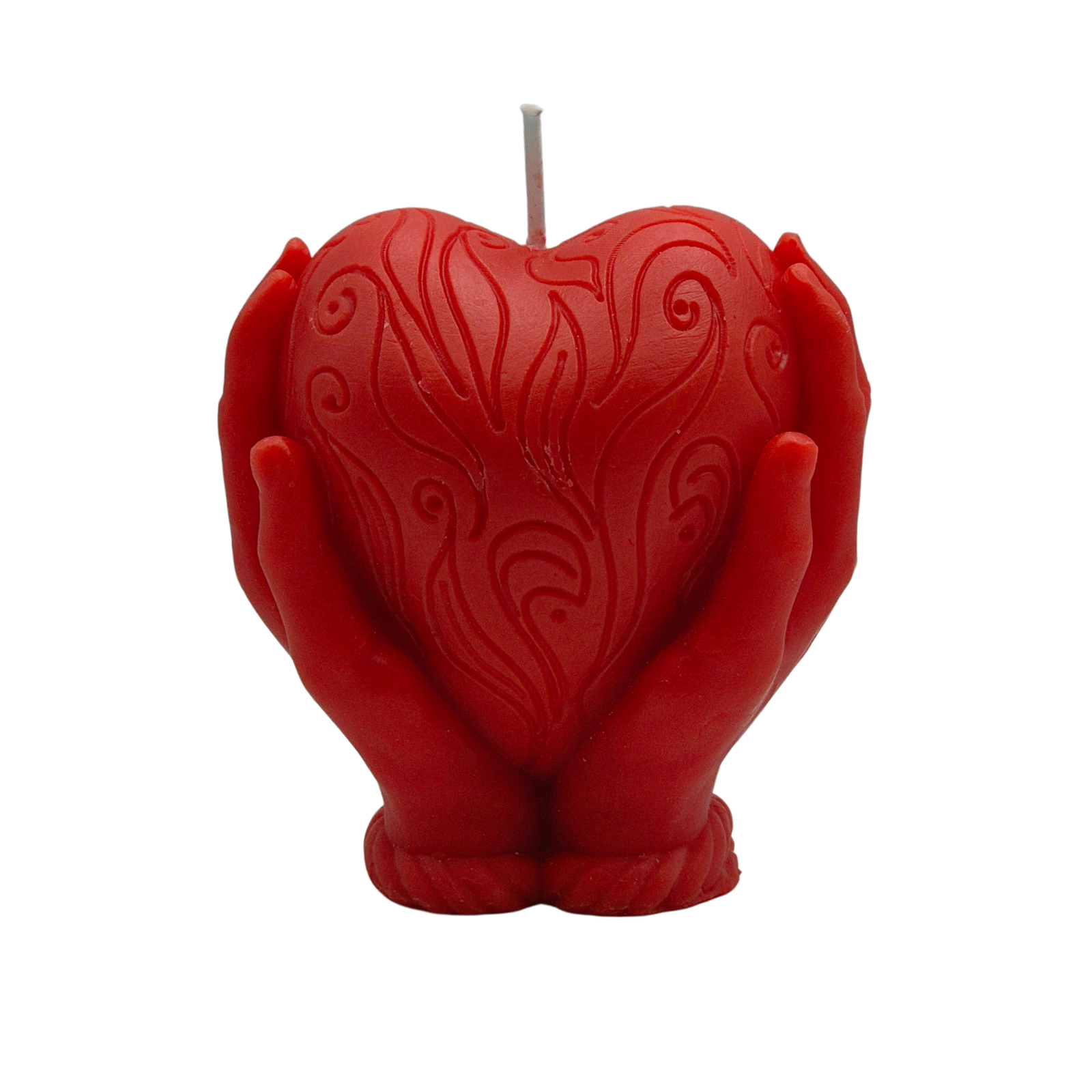 נר ריחני בצורת לב אדום לוהט, מוחזק בידיים מחבקות. מושלם כמתנה רומנטית מלאת תשוקה, ליום האהבה, ליום נישואין או לכל אירוע מיוחד אחר. הנר מוסיף אווירה אינטימית וחמה בחדר השינה, בסלון או בארוחה זוגית לאור נרות.