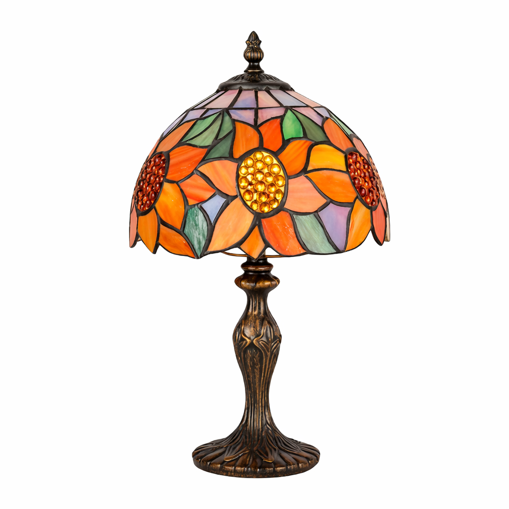 מנורת שולחן בסגנון טיפאני עם אהיל זכוכית צבעונית בדוגמת פרחים בגווני כתום, ירוק וסגול עדין. שילוב הצבעים יוצר תאורה חמימה, רכה ומלאת חיים, המוסיפה תחושת שמחה ואנרגיה לכל חלל. בסיס מתכתי מעוצב בגימור כהה מעניק יציבות ומראה קלאסי. מתאימה לסלון, חדר שינה, שידה, פינת קריאה, משרד או קליניקה – לפריט תאורה שהוא גם מוקד עיצובי מרשים.